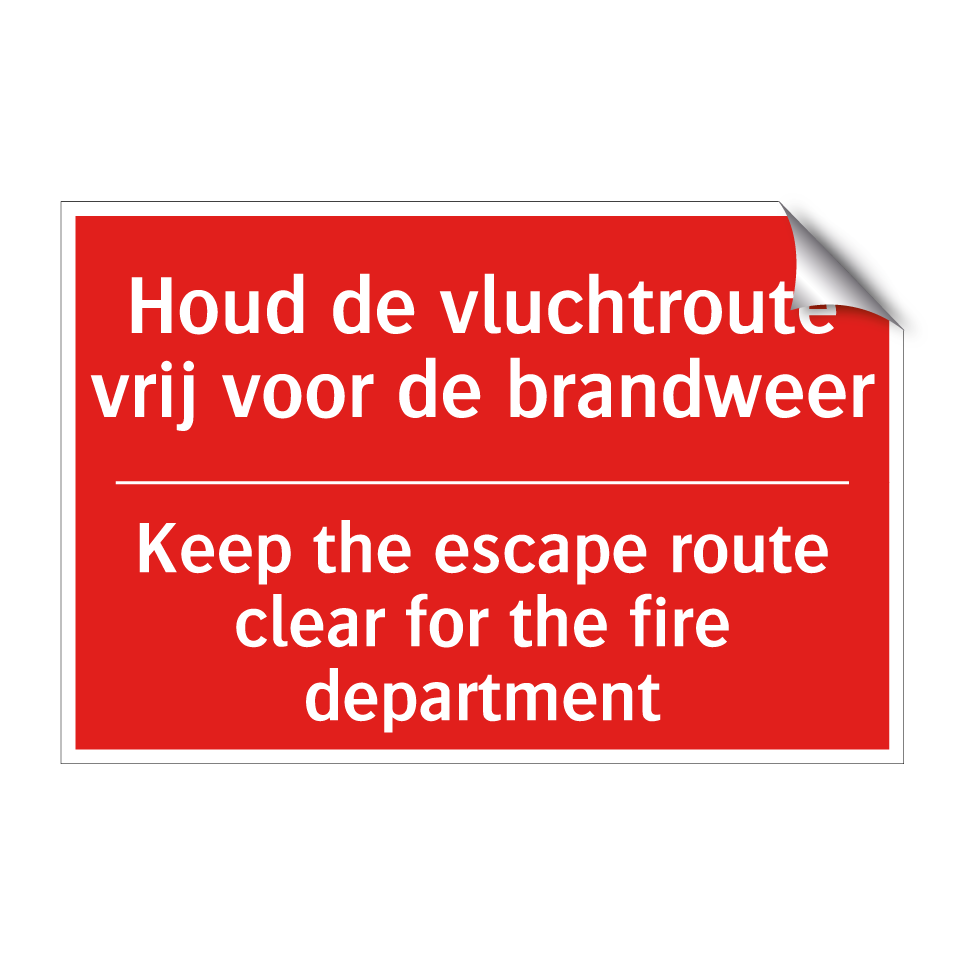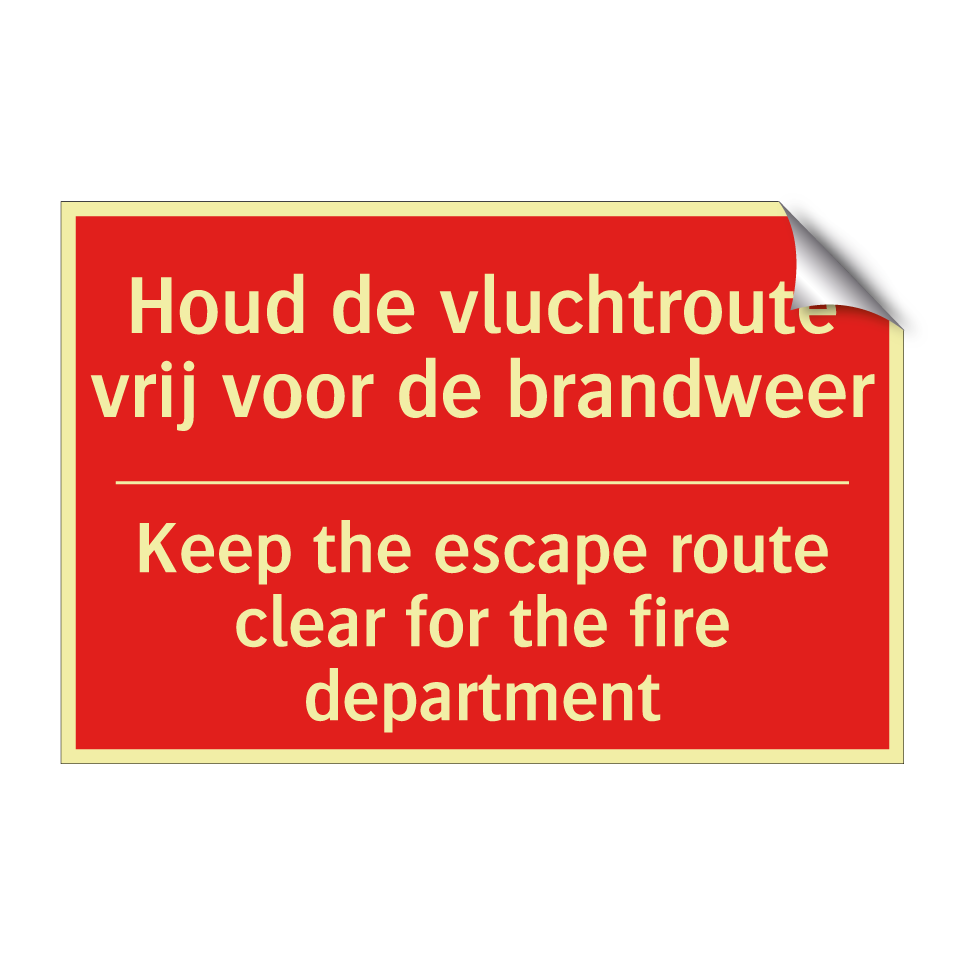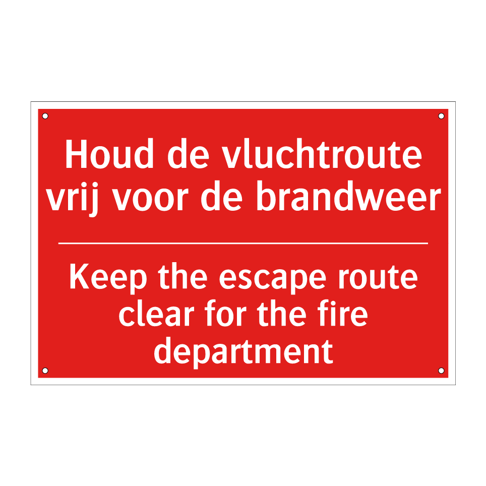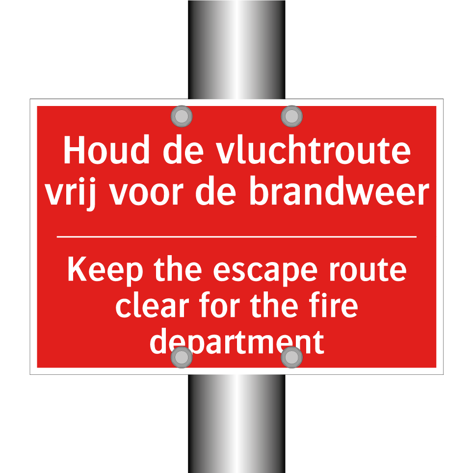 Brandbord met tekst Houd de vluchtroute vrij voor de brandweer - Keep the escape route clear for the fire department