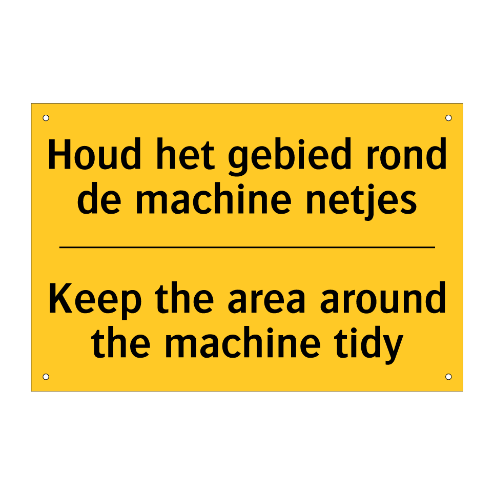 Waarschuwingsbord met de tekst Houd het gebied rond de machine netjes / Keep the area around the machine tidy