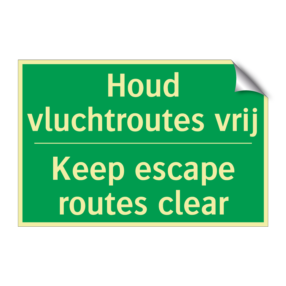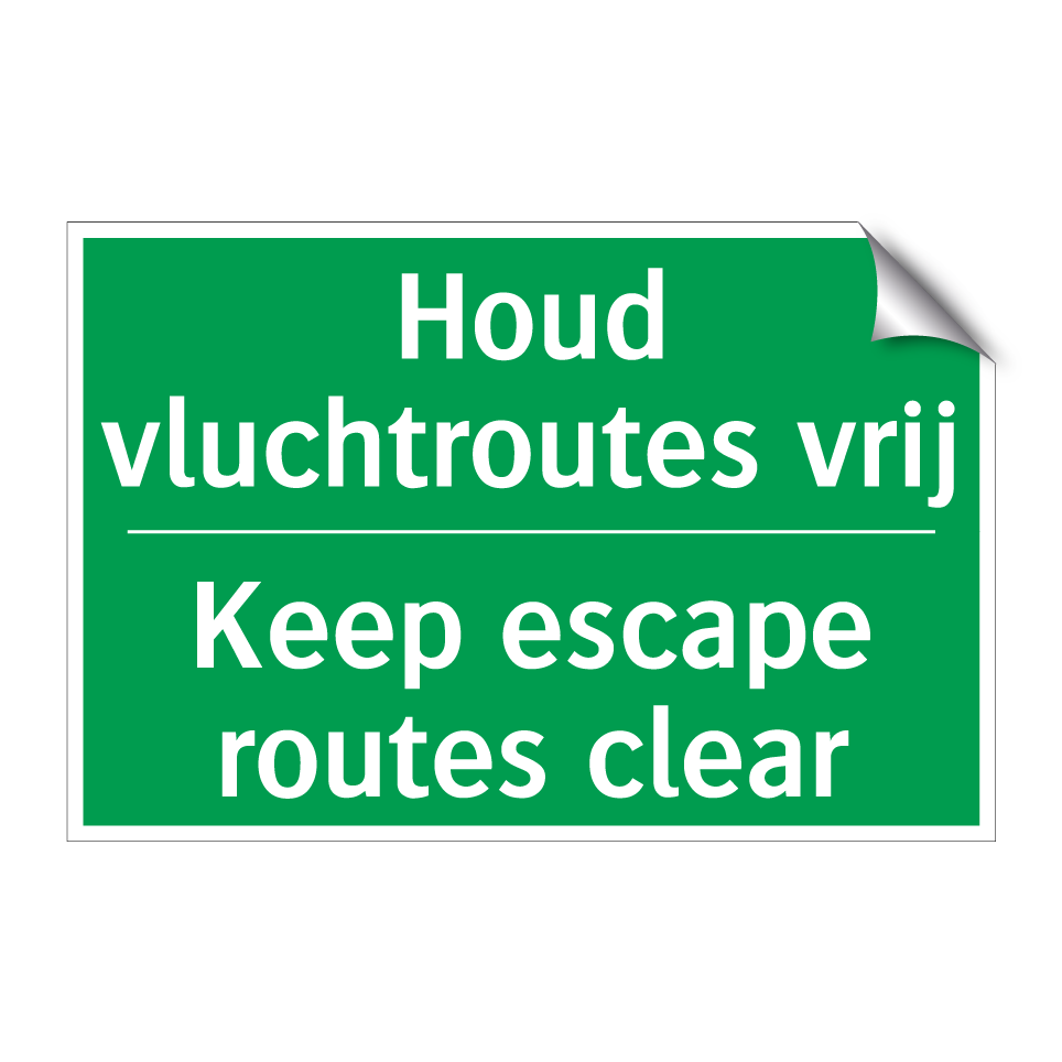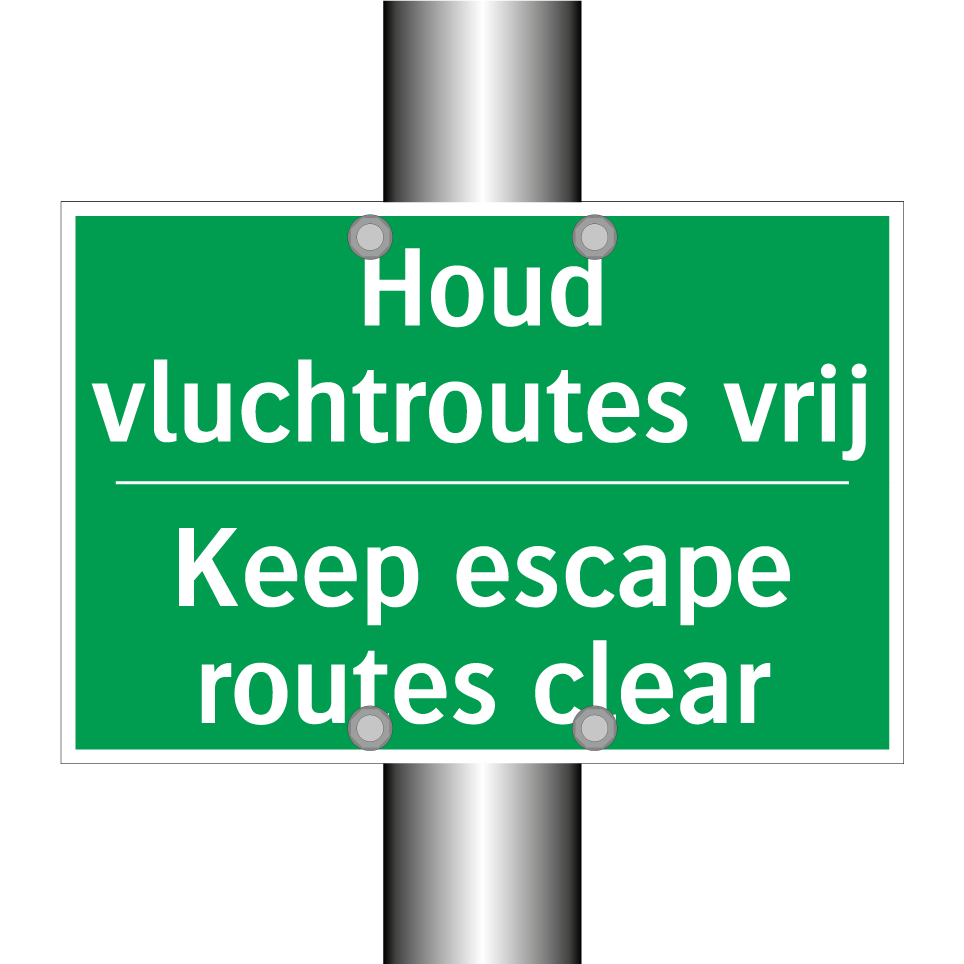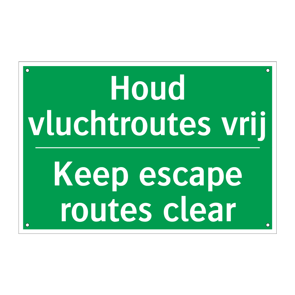 Noodbord met tekst Houd vluchtroutes vrij / Keep escape routes clear