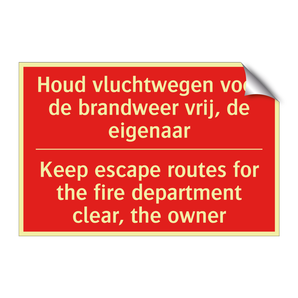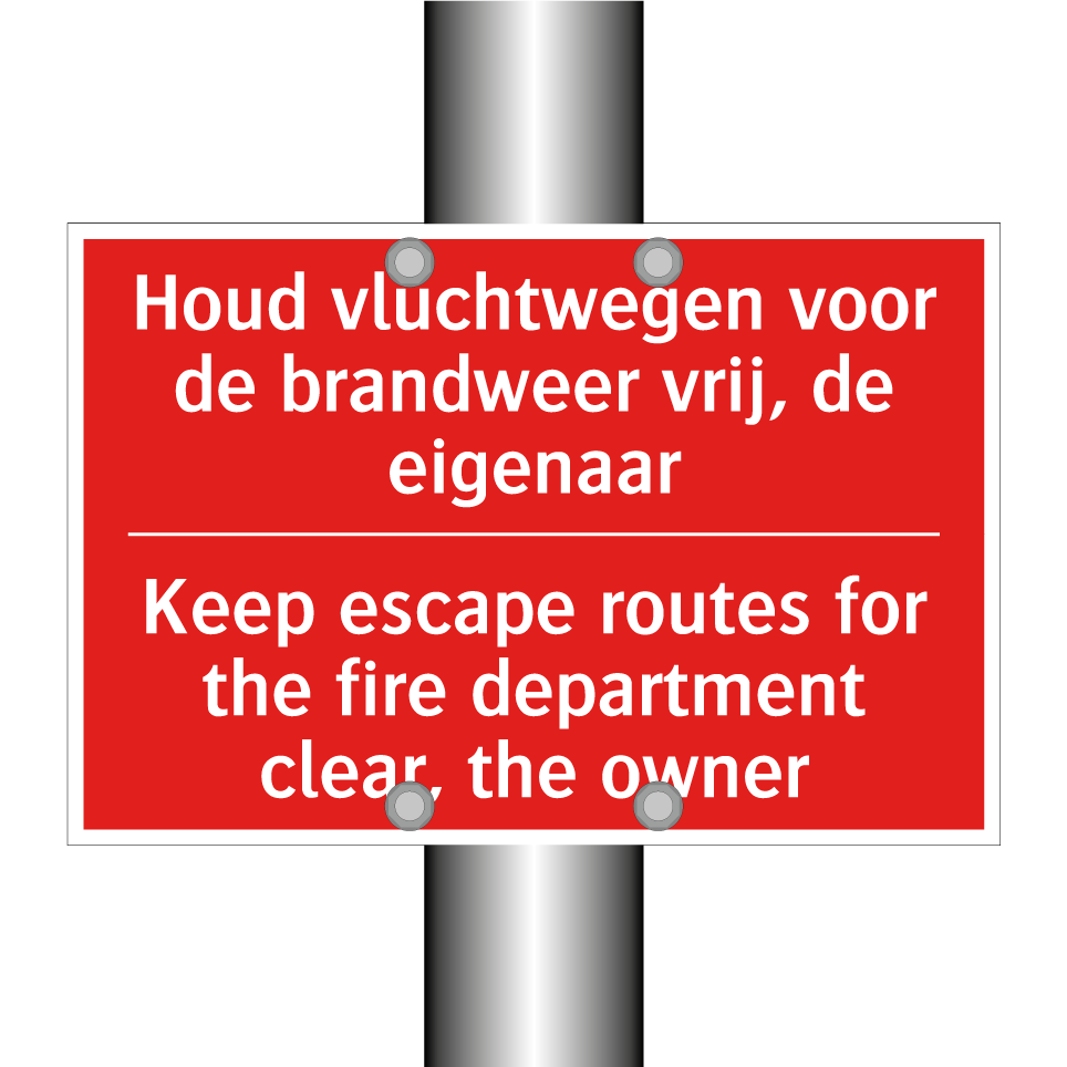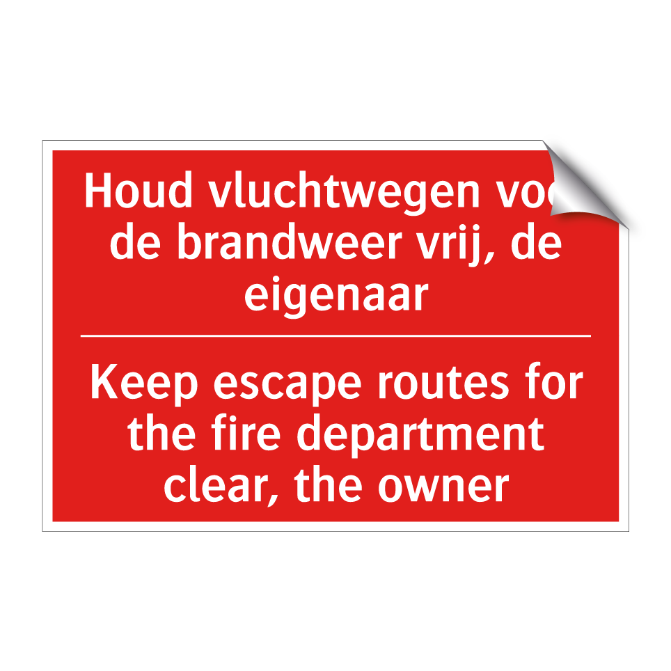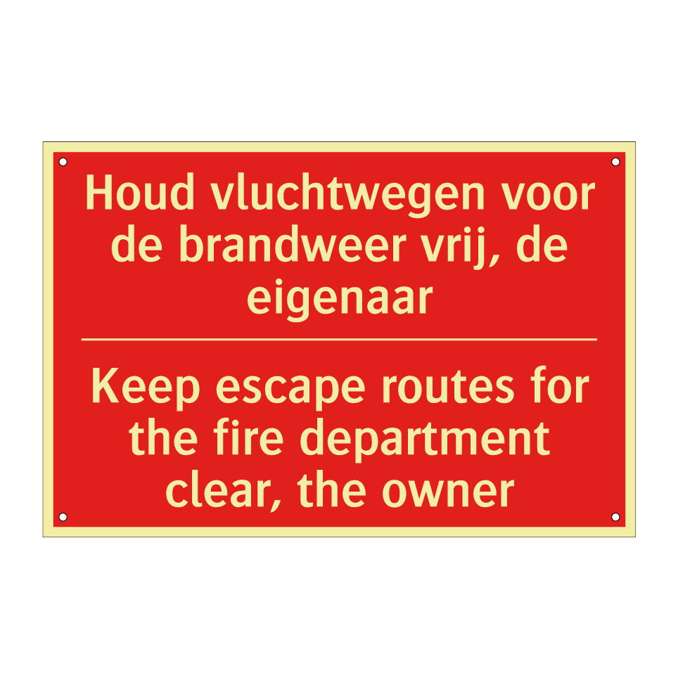 Brandbord met tekst Houd vluchtwegen voor de brandweer vrij, de eigenaar - Keep escape routes for the fire department clear, the owner