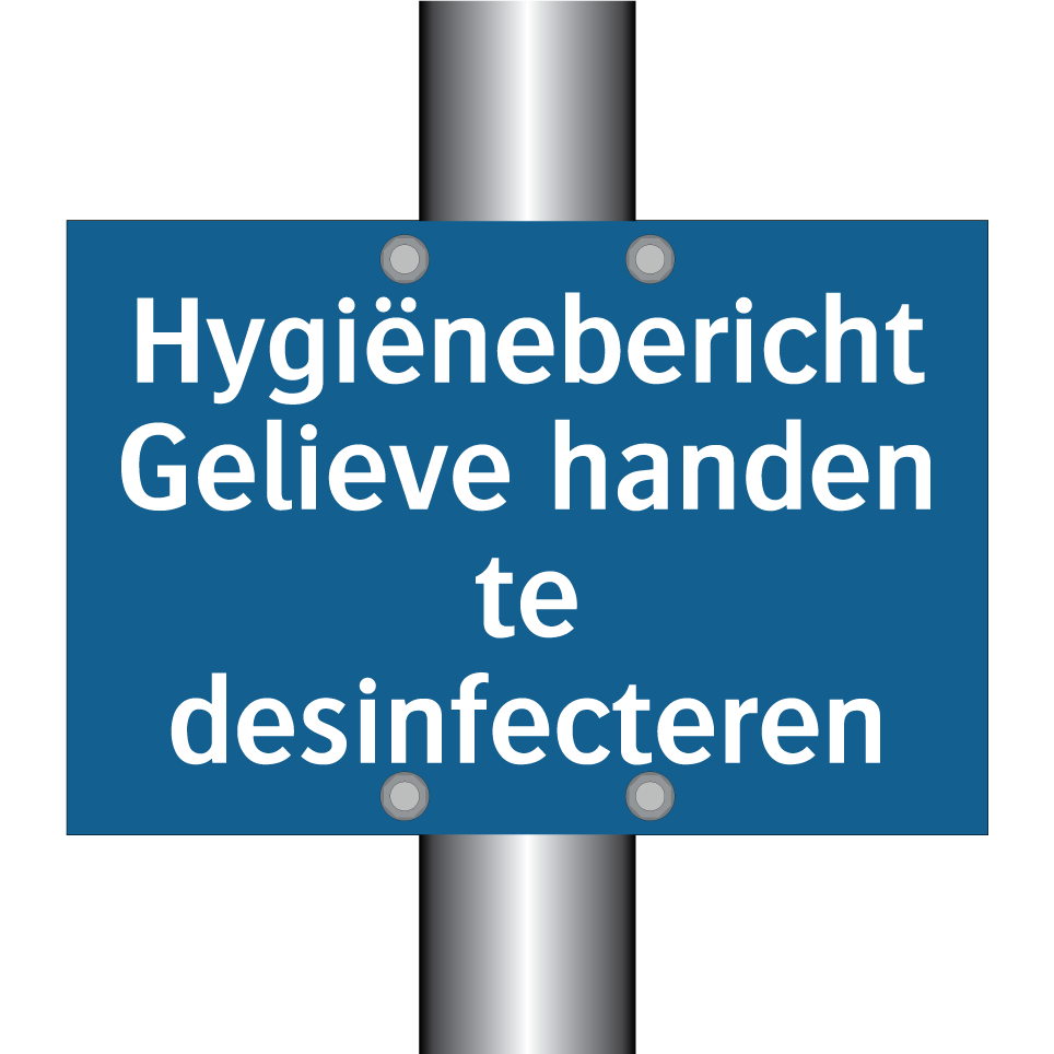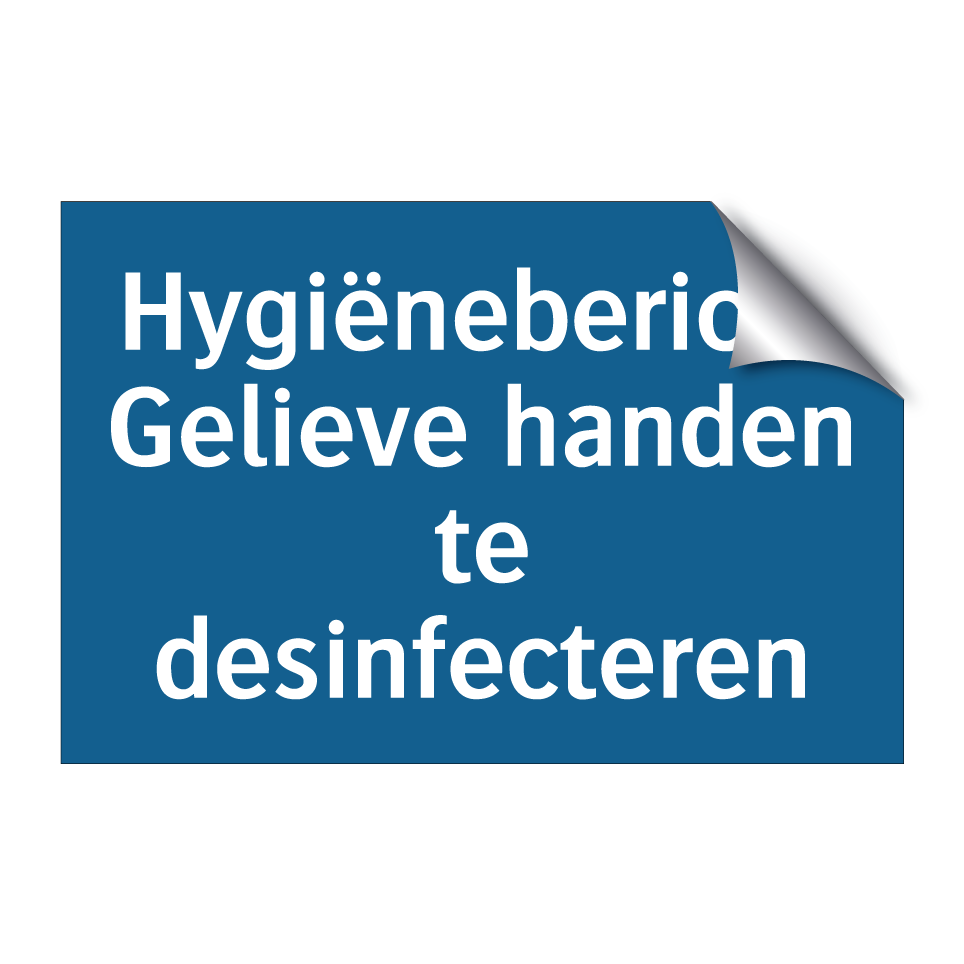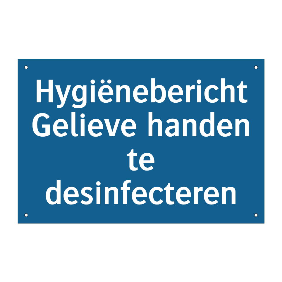 Verplichte bord met de tekst Hygiënebericht Gelieve handen te desinfecteren