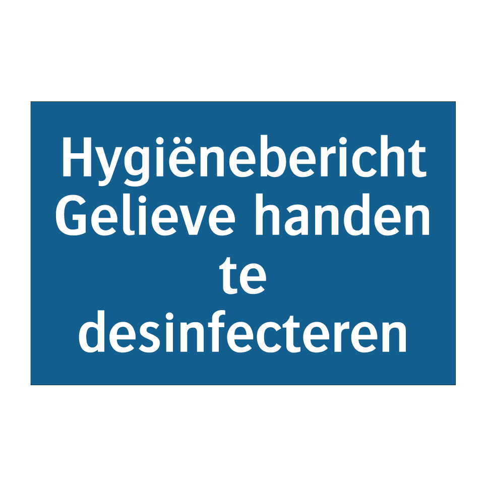 Deze verplichte bord met blauwe achtergrond en witte tekst is ideaal voor gebruik in omgevingen waar hygiëne van het grootste belang is. Plaats deze bord bij ingangen van ziekenhuizen, klinieken, kantoren, scholen, en andere openbare ruimtes om bezoekers eraan te herinneren hun handen te desinfecteren. Dit bordje helpt bij het bevorderen van een schone en veilige omgeving door het benadrukken van het belang van handdesinfectie. Door deze duidelijke en zichtbare boodschap te plaatsen, draagt u bij aan de gezondheid en veiligheid van iedereen in de ruimte.