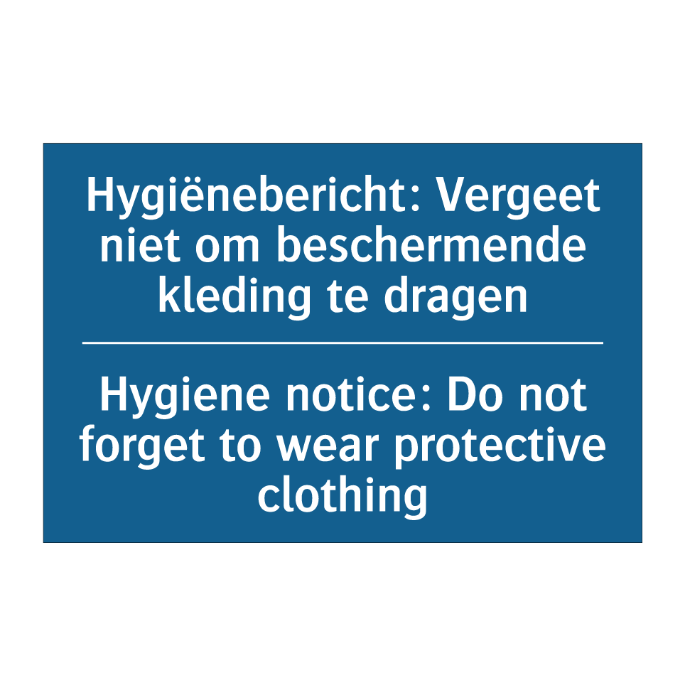 Verplichte bord met de tekst Hygiënebericht: Vergeet niet om beschermende kleding te dragen - Hygiene notice: Do not forget to wear protective clothing