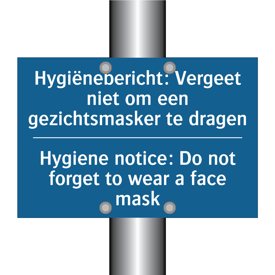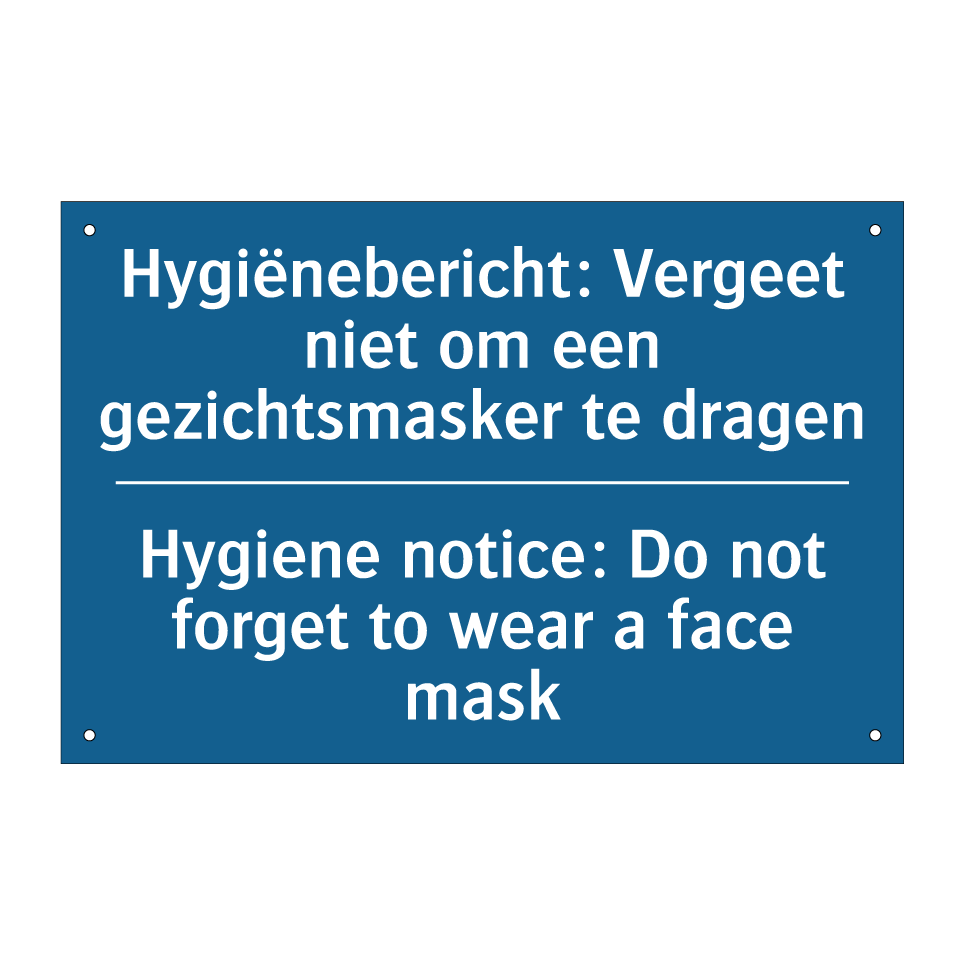 Verplichte bord met de tekst Hygiënebericht: Vergeet niet om een gezichtsmasker te dragen - Hygiene notice: Do not forget to wear a face mask