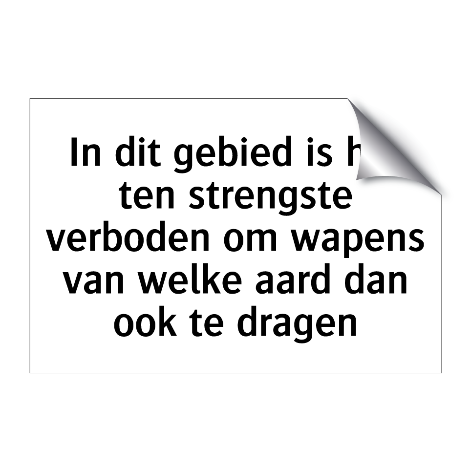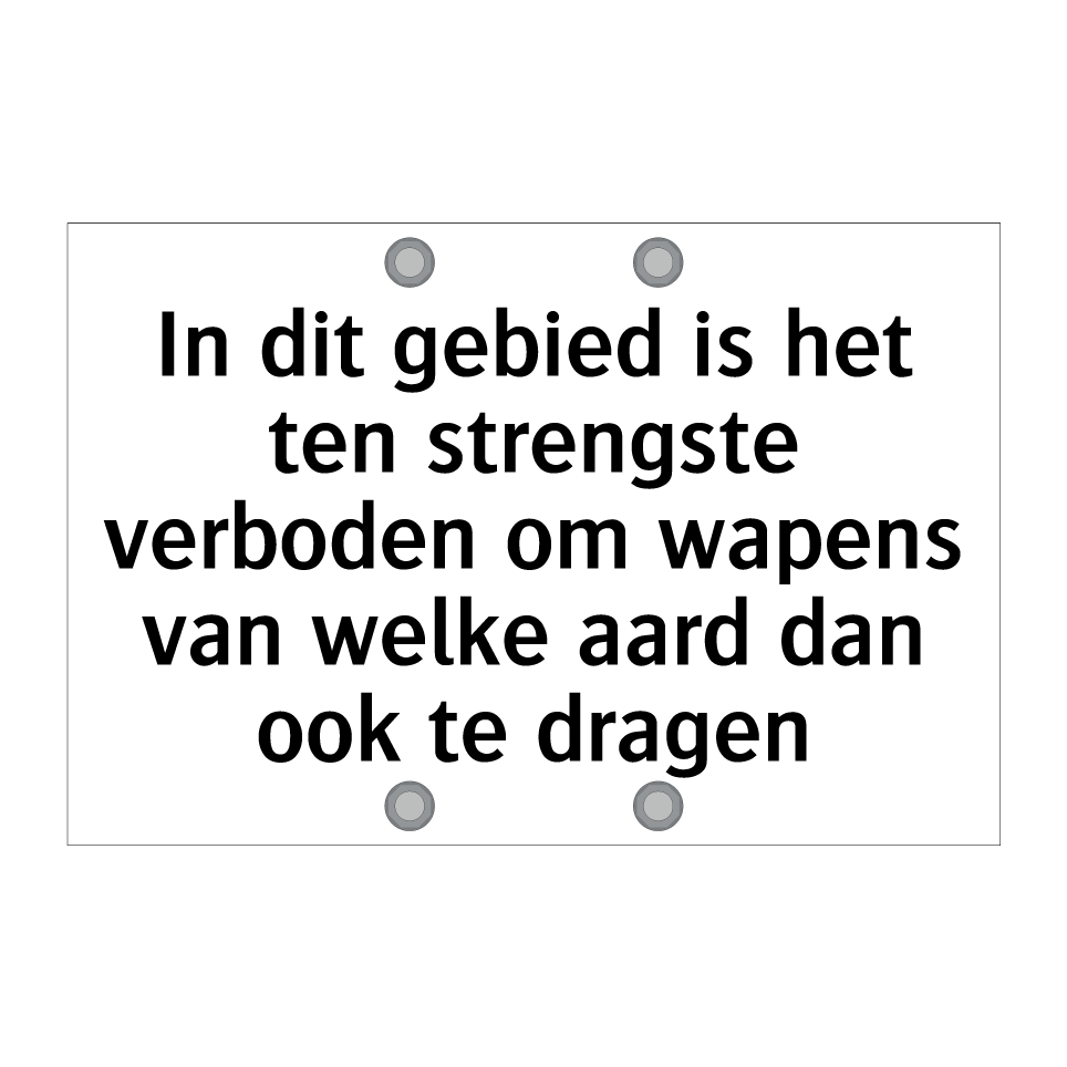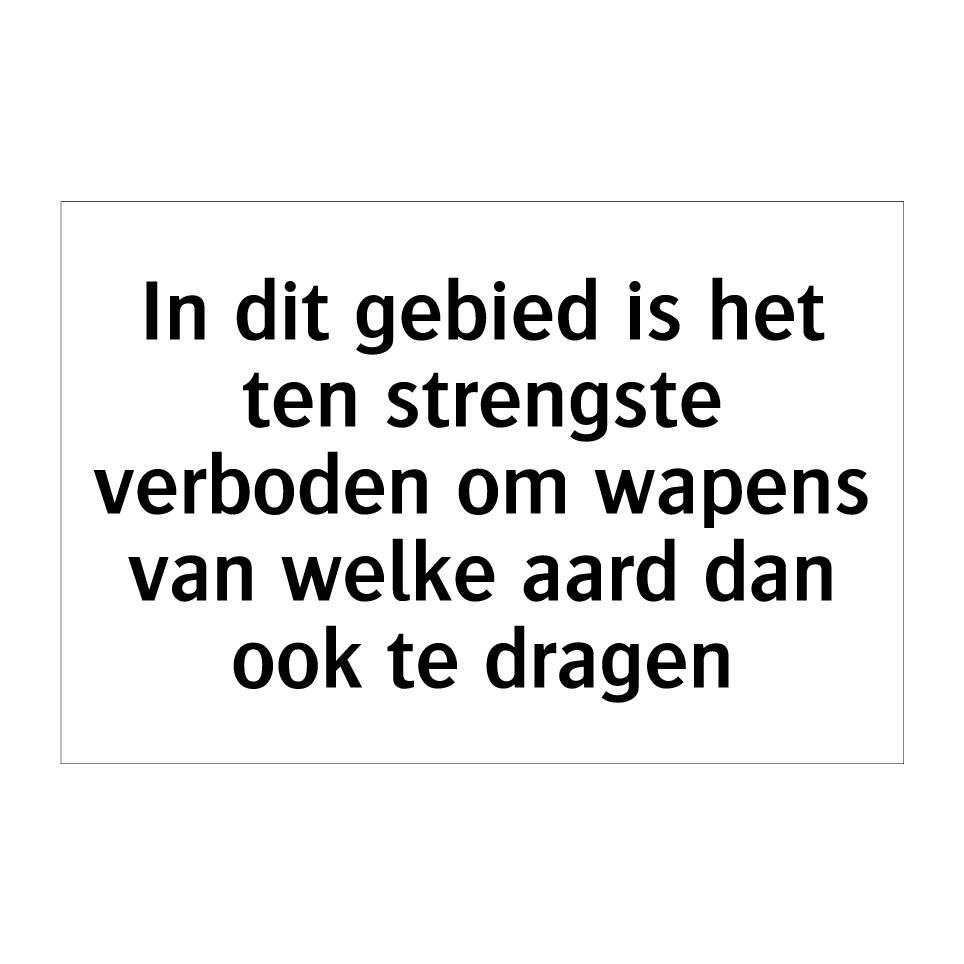 Verbodsbord met de tekst In dit gebied is het ten strengste verboden om wapens van welke aard dan ook te dragen