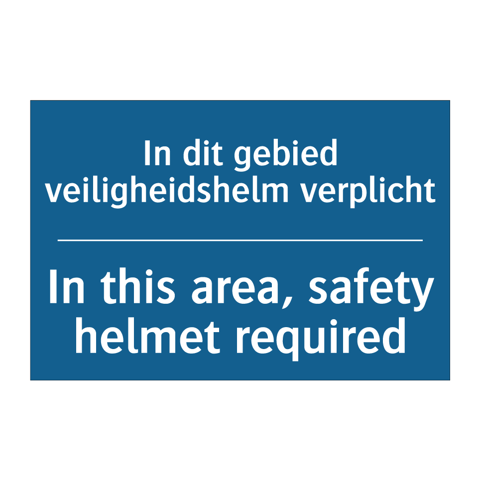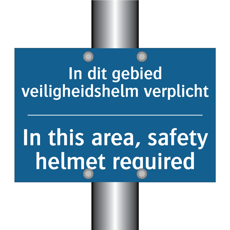 Verplichte bord met de tekst In dit gebied veiligheidshelm verplicht - In this area, safety helmet required