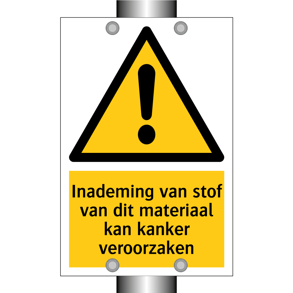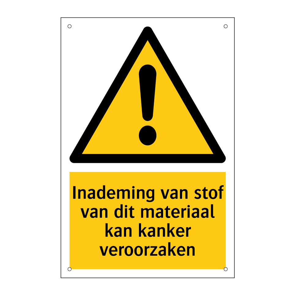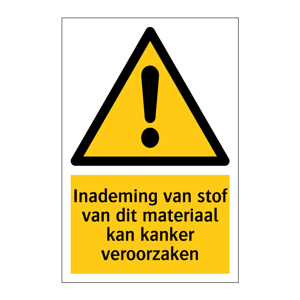 Waarschuwingsbord met de tekst Inademing van stof van dit materiaal kan kanker veroorzaken