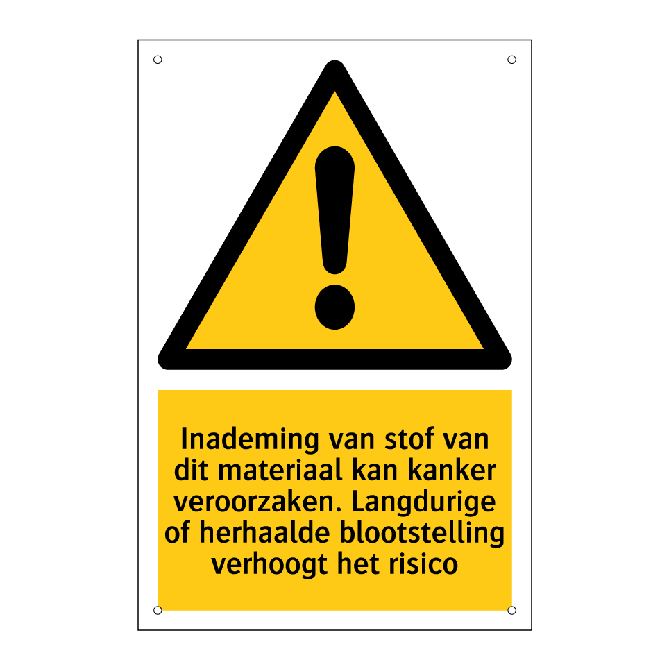 Waarschuwingsbord met de tekst Inademing van stof van dit materiaal kan kanker veroorzaken. Langdurige of herhaalde blootstelling verhoogt het risico