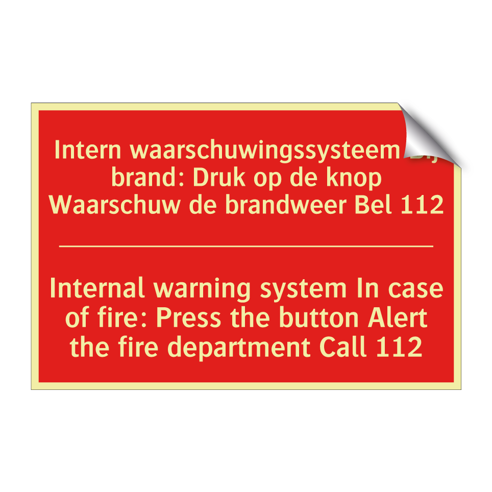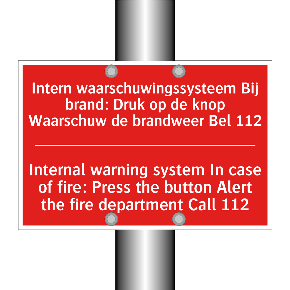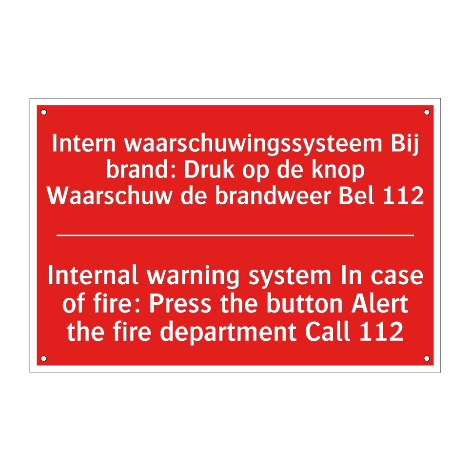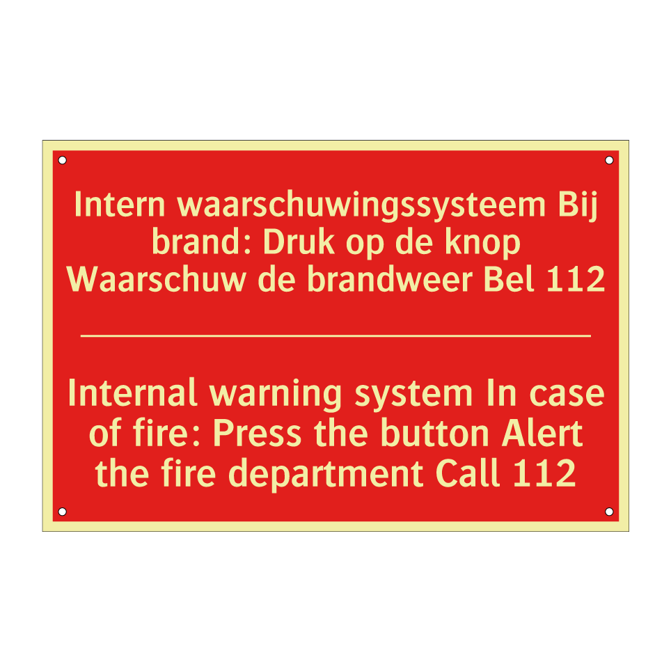 Brandbord met tekst Intern waarschuwingssysteem Bij brand: Druk op de knop Waarschuw de brandweer Bel 112 / Internal warning system In case of fire: Press the button Alert the fire department Call 112