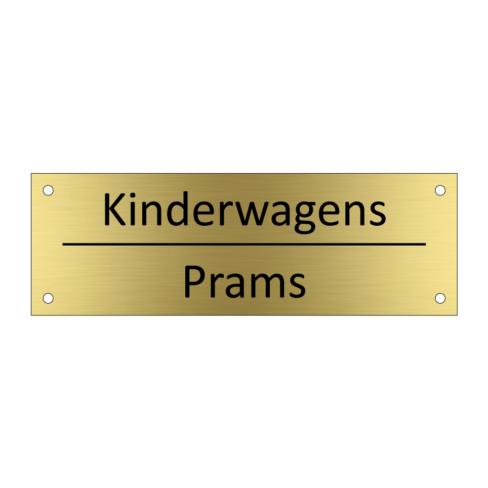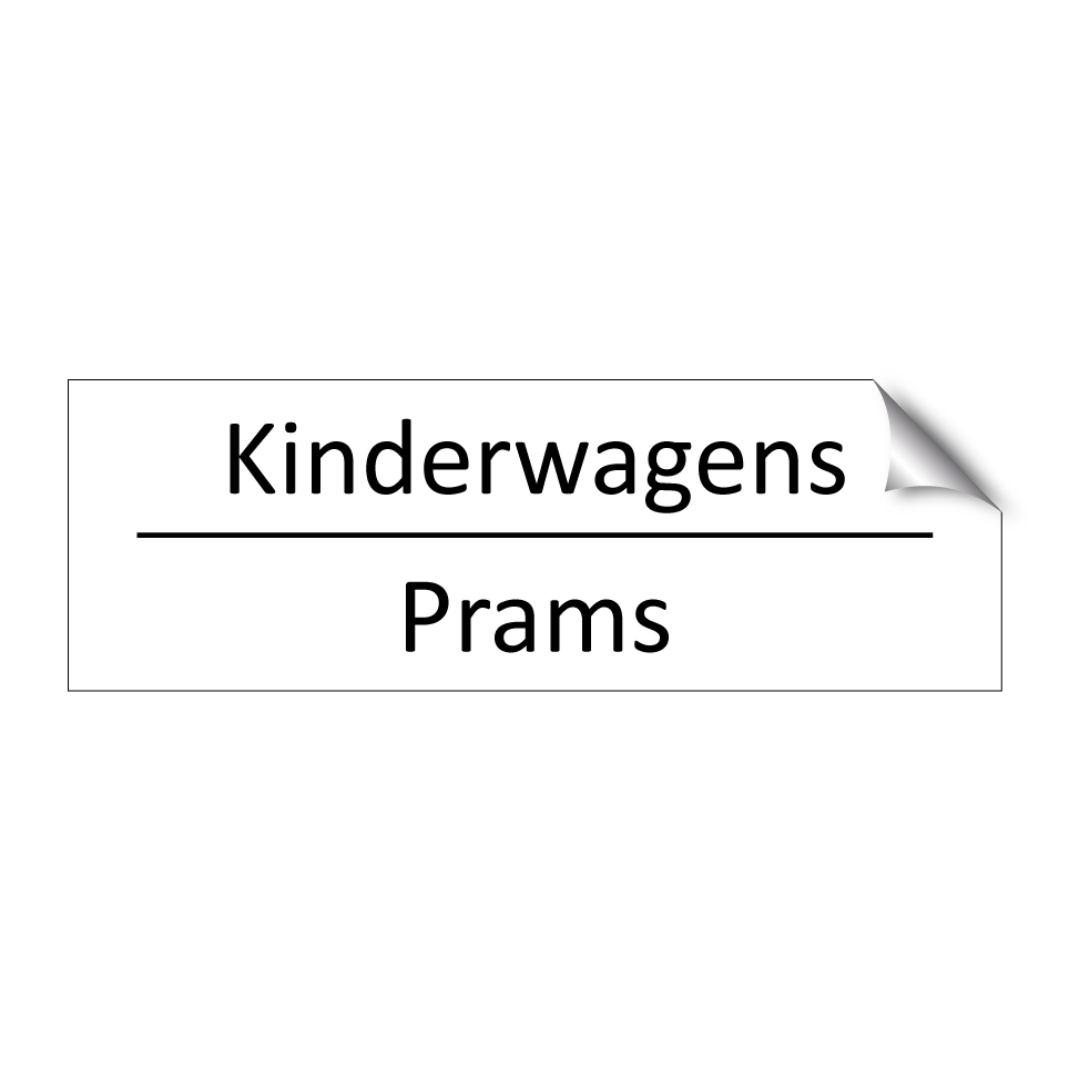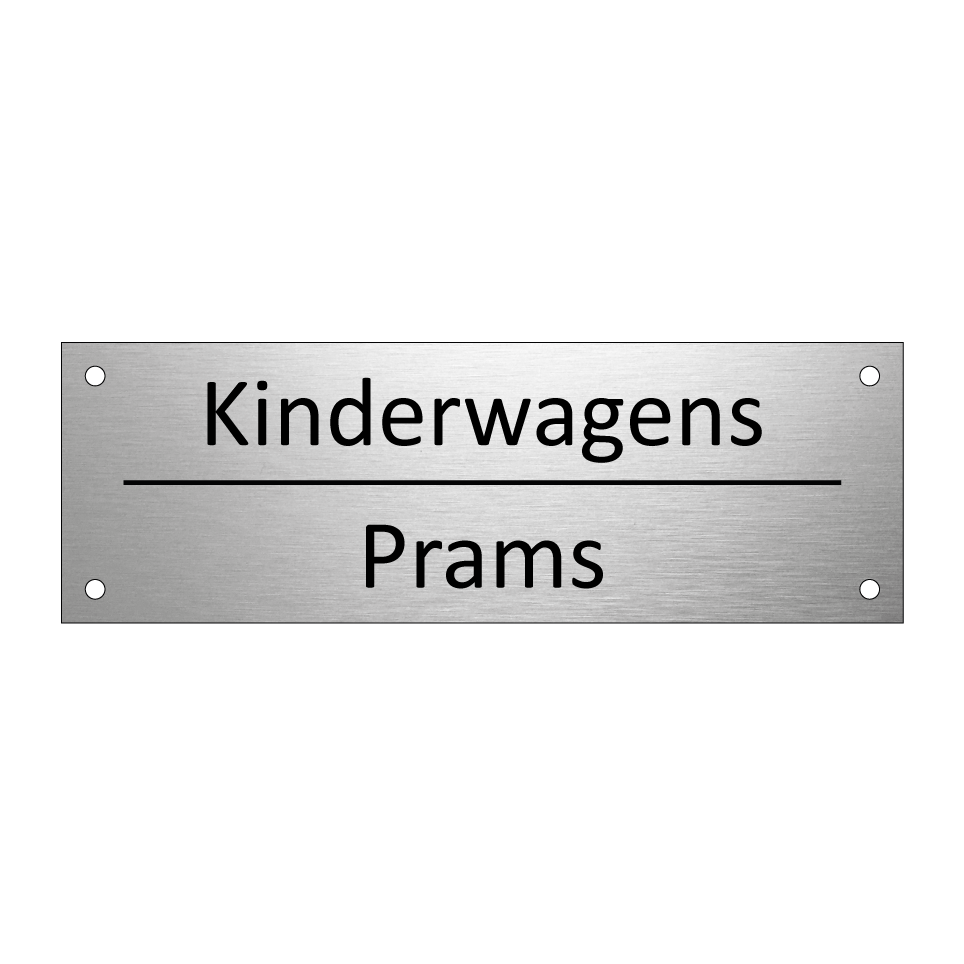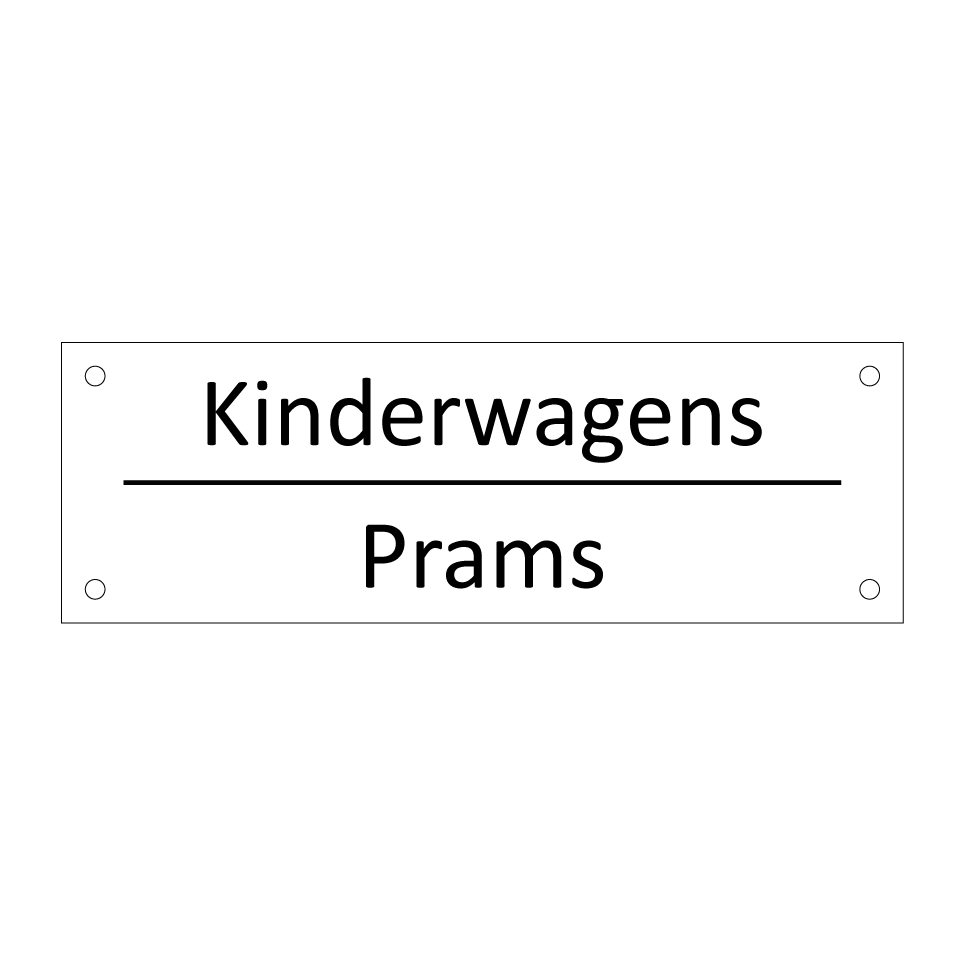 Informatiebord met tekst in het nederlands en engels. Dit bord luidt: Kinderwagens evenals met de engelse vertaling Prams.