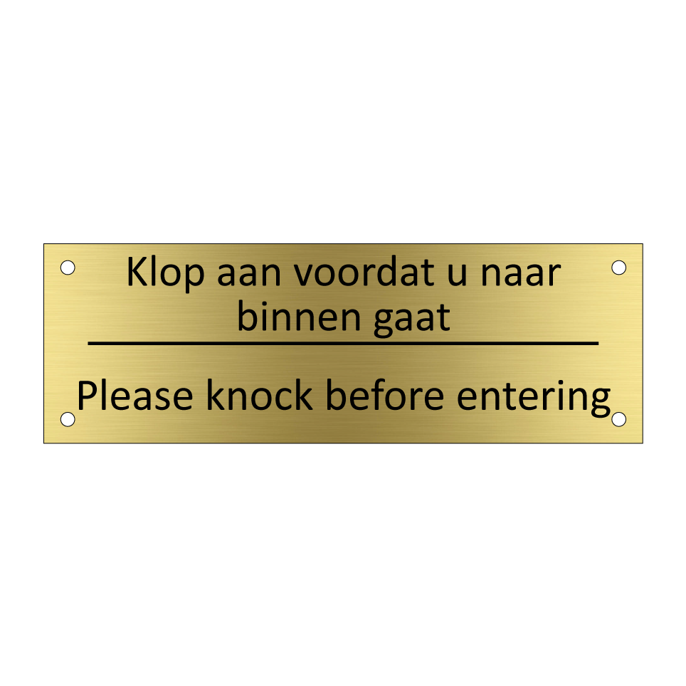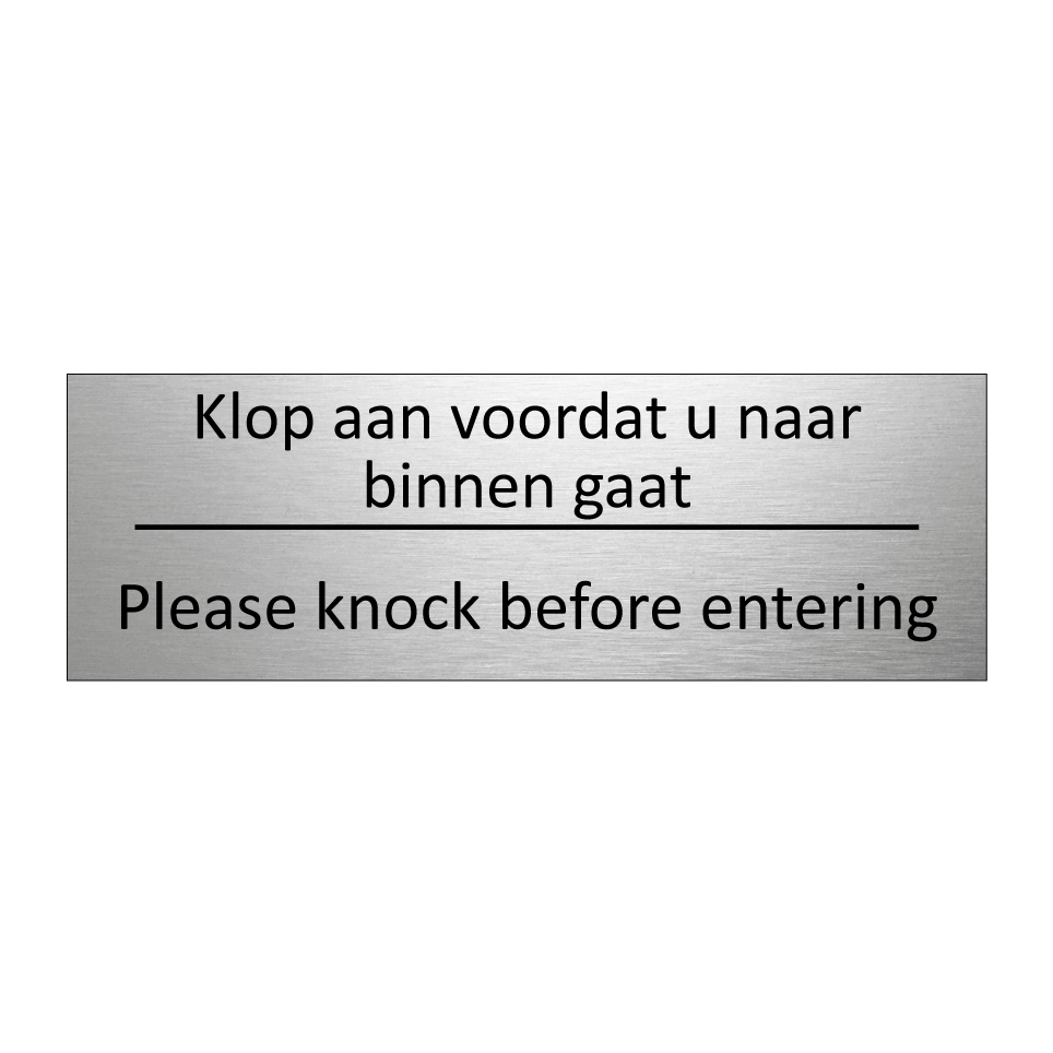 Informatiebord met tekst in het nederlands en engels. Dit bord luidt: Klop aan voordat u naar binnen gaat evenals met de engelse vertaling Please knock before entering.