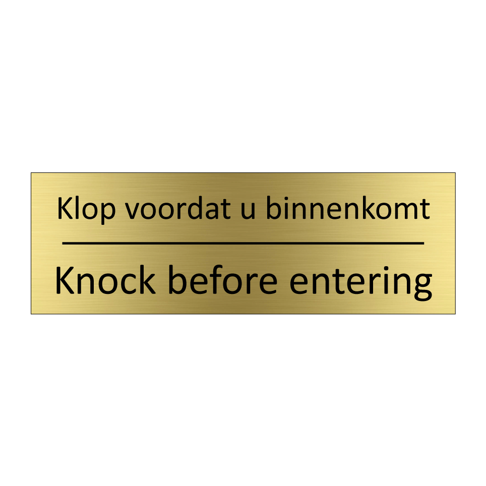 Informatiebord met tekst in het nederlands en engels. Dit bord luidt: Klop voordat u binnenkomt evenals met de engelse vertaling Knock before entering.