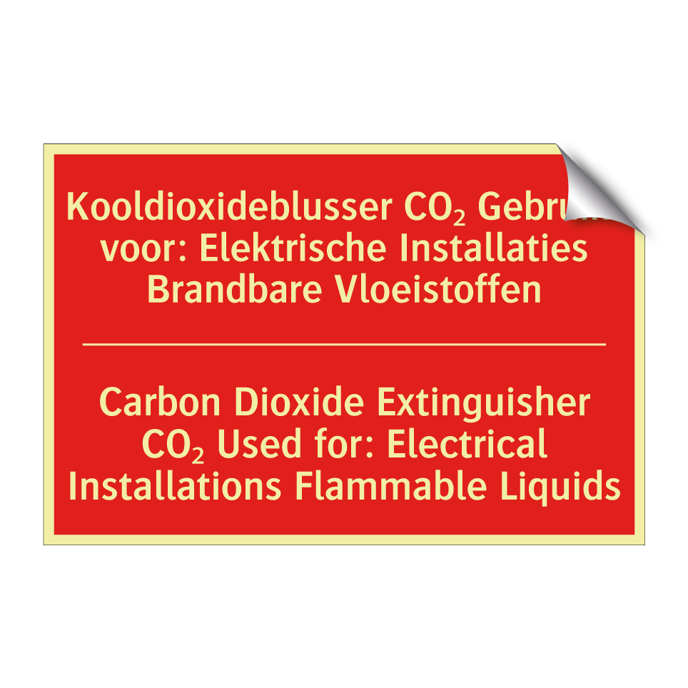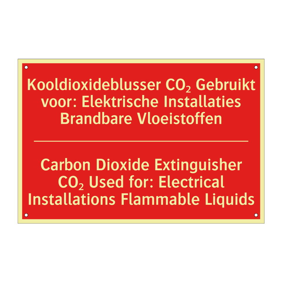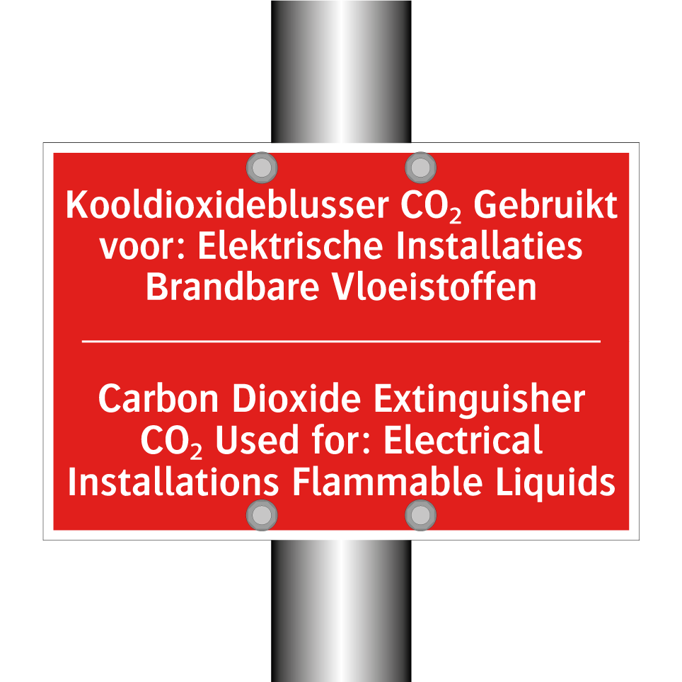 Brandbord met tekst Kooldioxideblusser CO₂ Gebruikt voor: Elektrische Installaties Brandbare Vloeistoffen / Carbon Dioxide Extinguisher CO₂ Used for: Electrical Installations Flammable Liquids