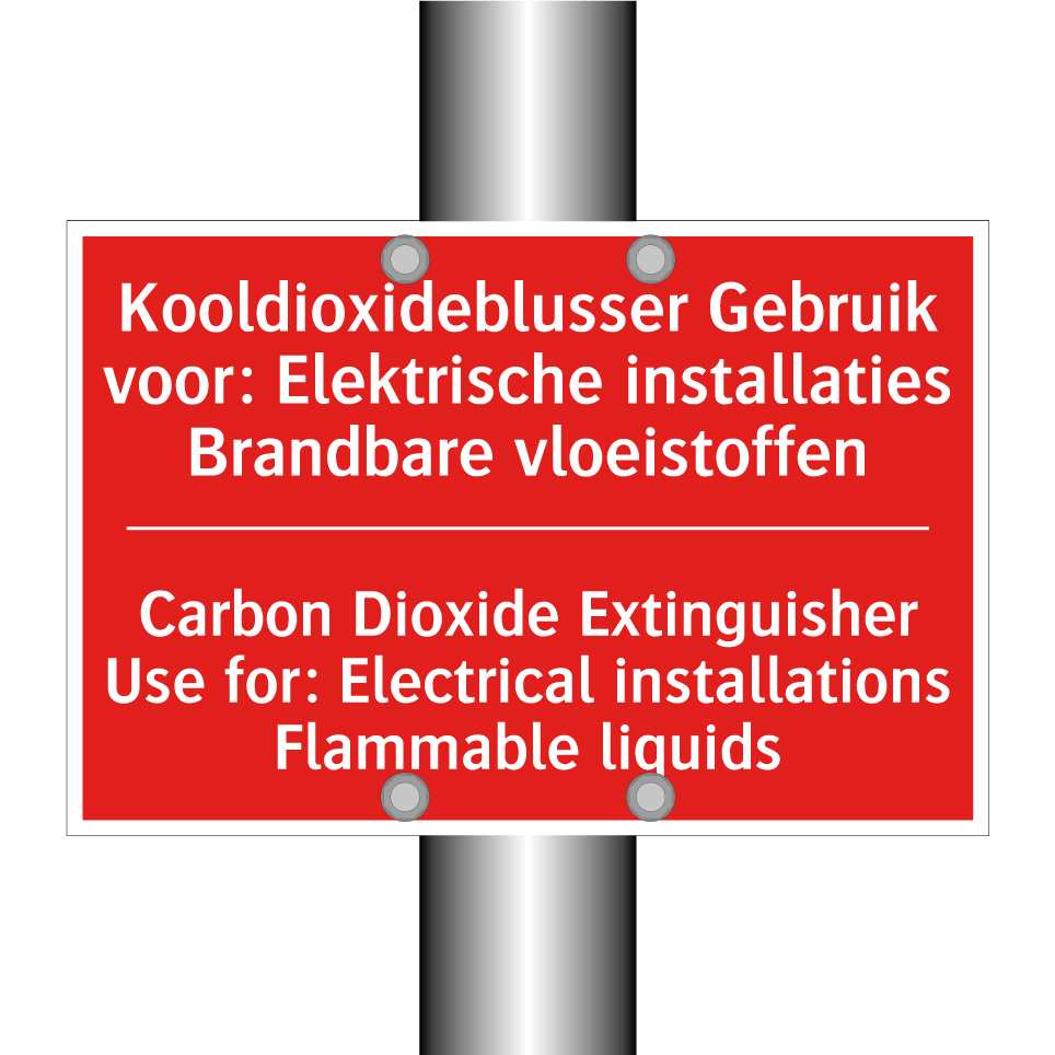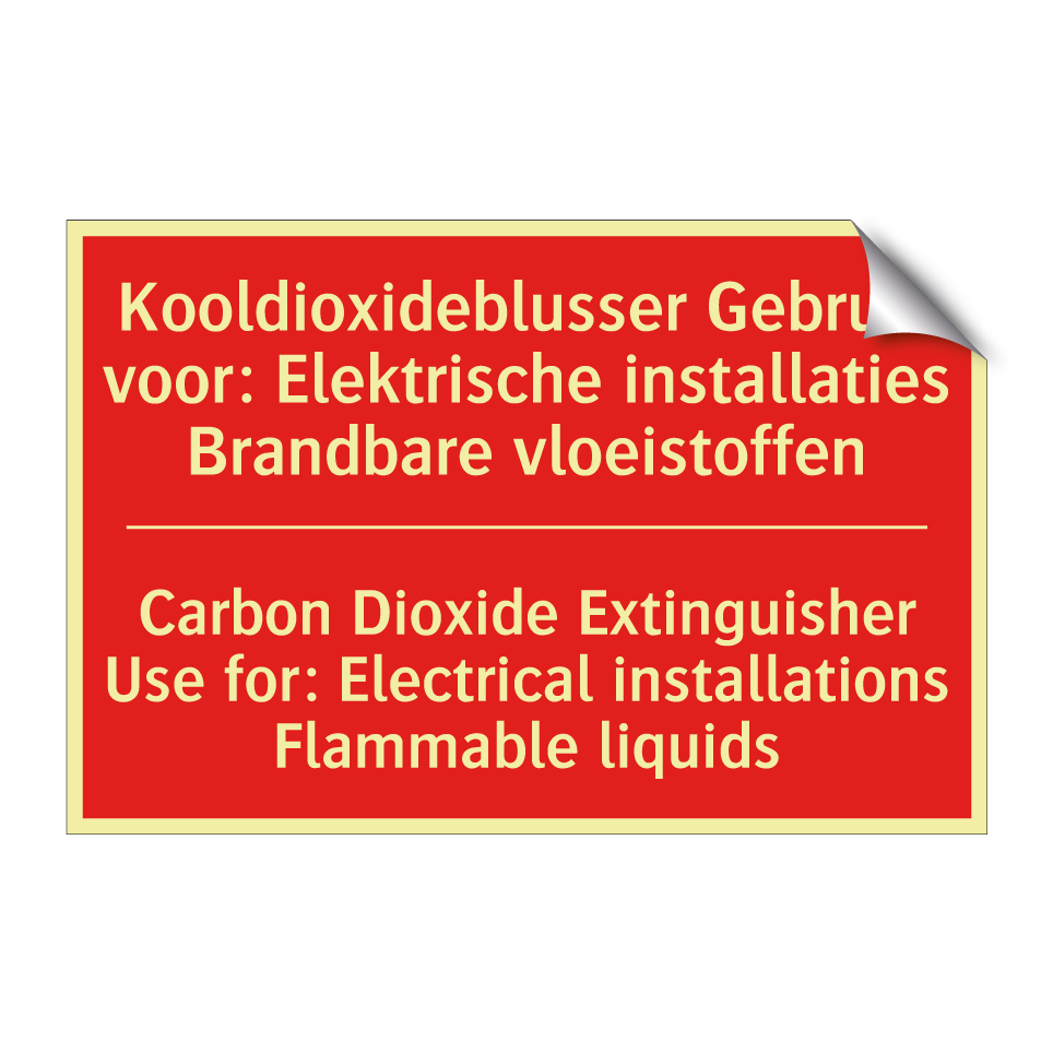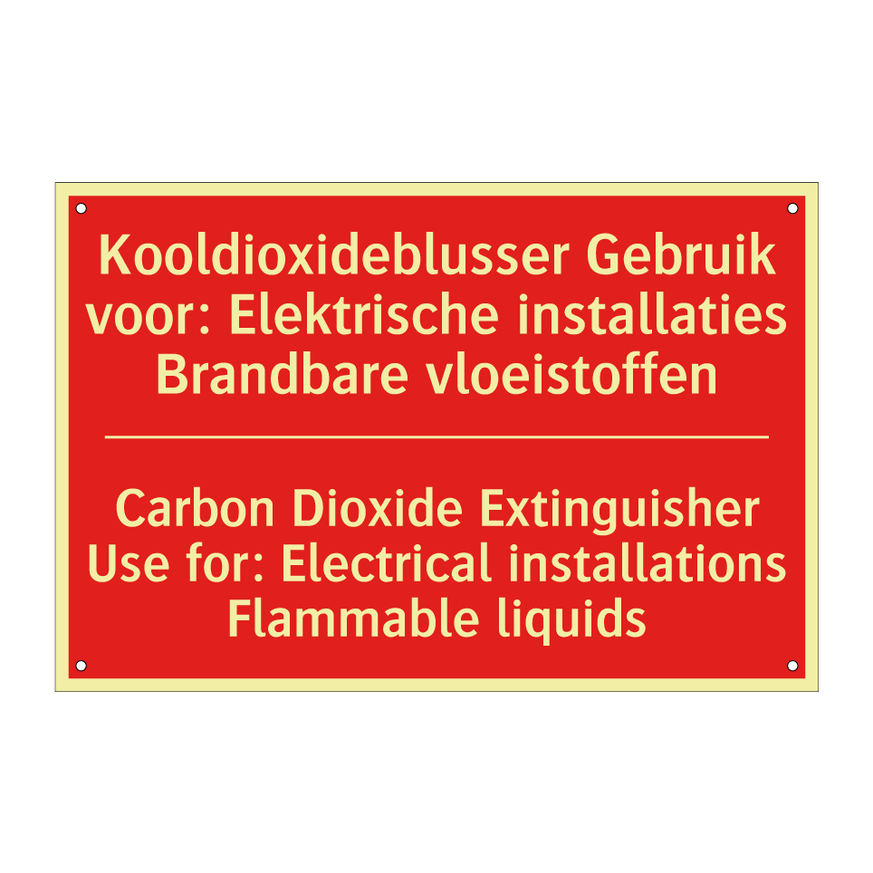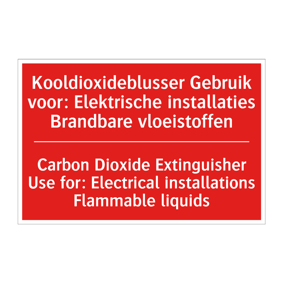 Brandbord met tekst Kooldioxideblusser Gebruik voor: Elektrische installaties Brandbare vloeistoffen / Carbon Dioxide Extinguisher Use for: Electrical installations Flammable liquids
