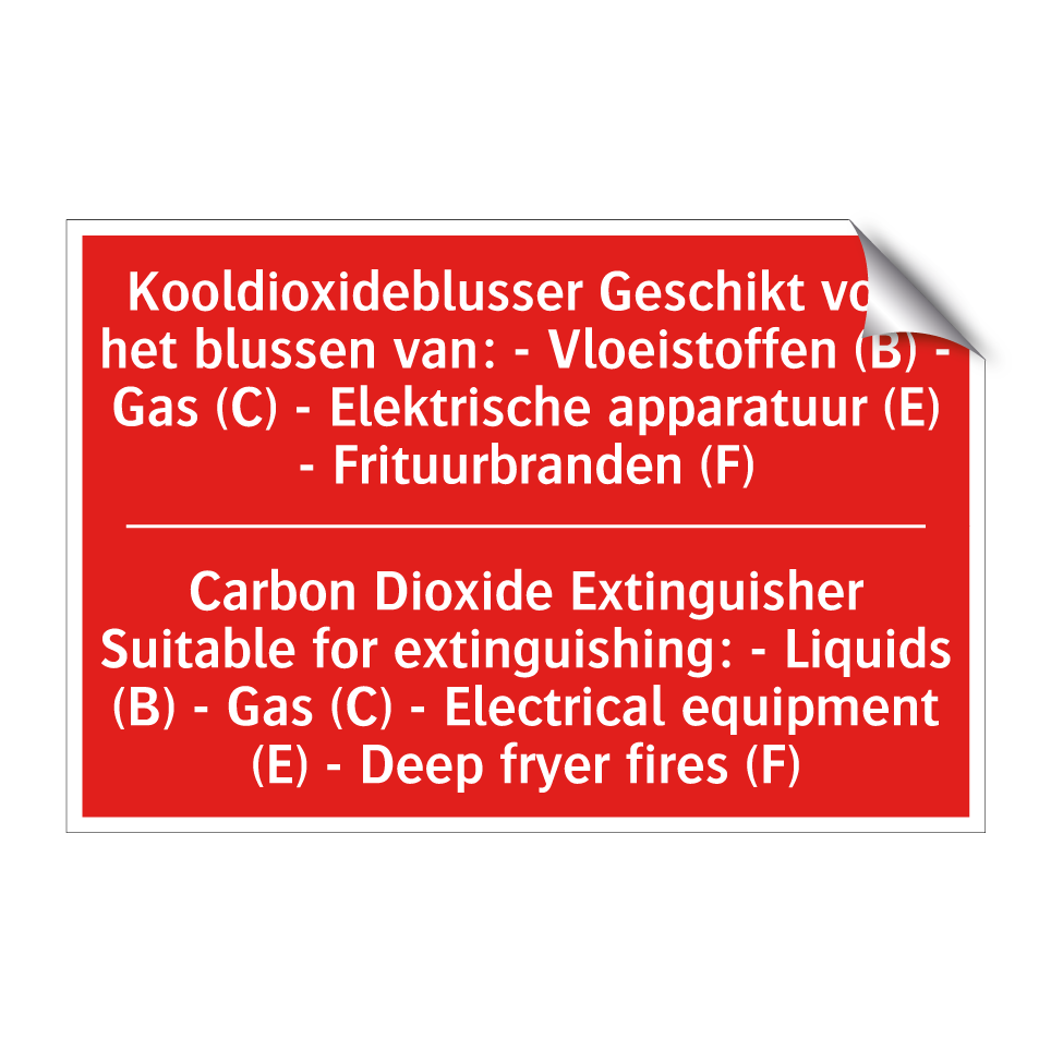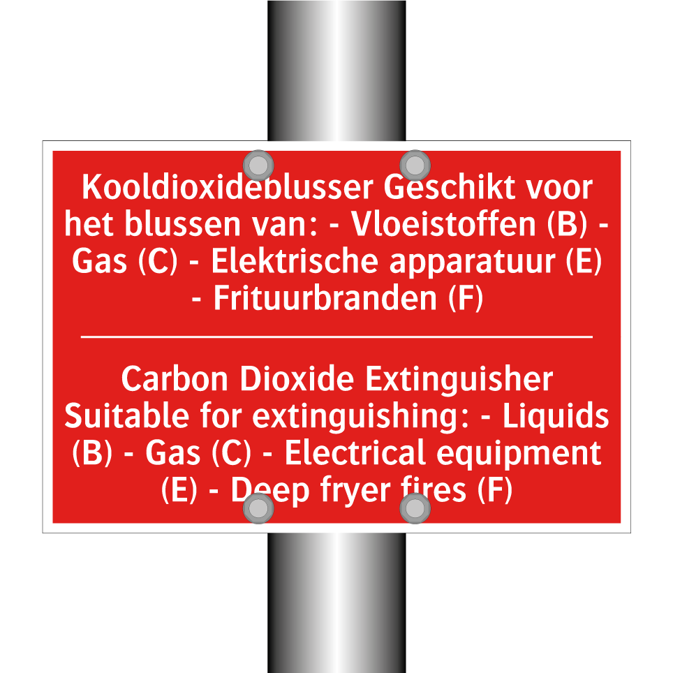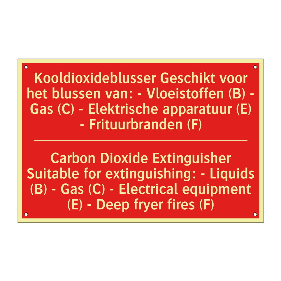 Brandbord met tekst Kooldioxideblusser Geschikt voor het blussen van: - Vloeistoffen (B) - Gas (C) - Elektrische apparatuur (E) - Frituurbranden (F) / Carbon Dioxide Extinguisher Suitable for extinguishing: - Liquids (B) - Gas (C) - Electrical equipment (E) - Deep fryer fires (F)