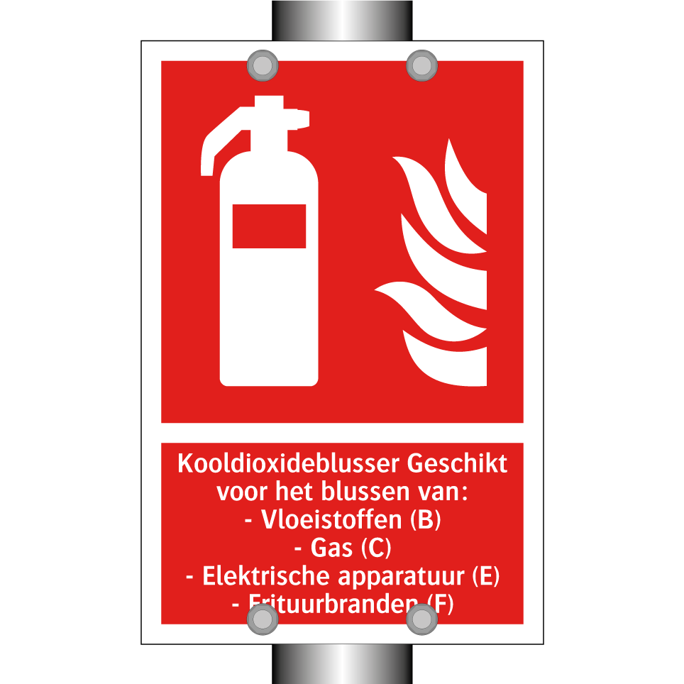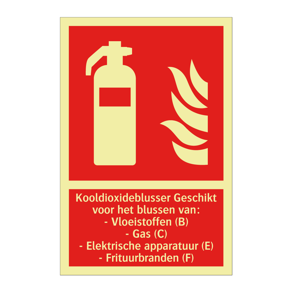 Brandbord met tekst Kooldioxideblusser Geschikt voor het blussen van: - Vloeistoffen (B) - Gas (C) - Elektrische apparatuur (E) - Frituurbranden (F)