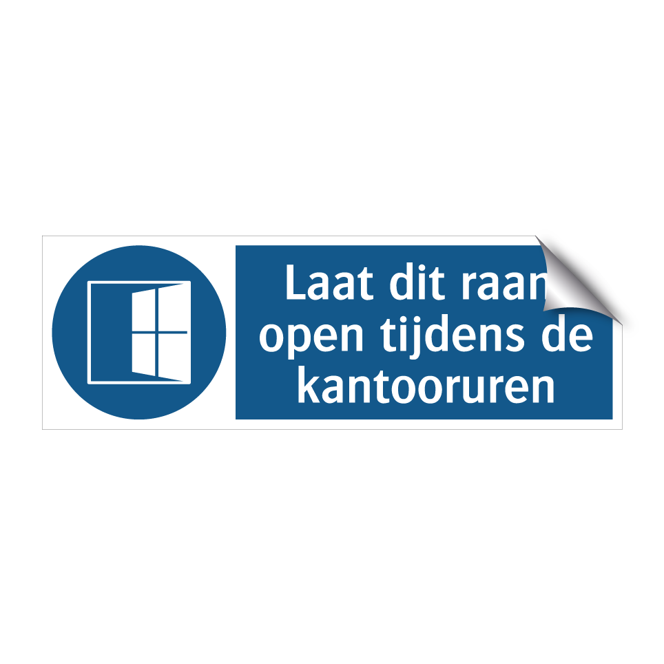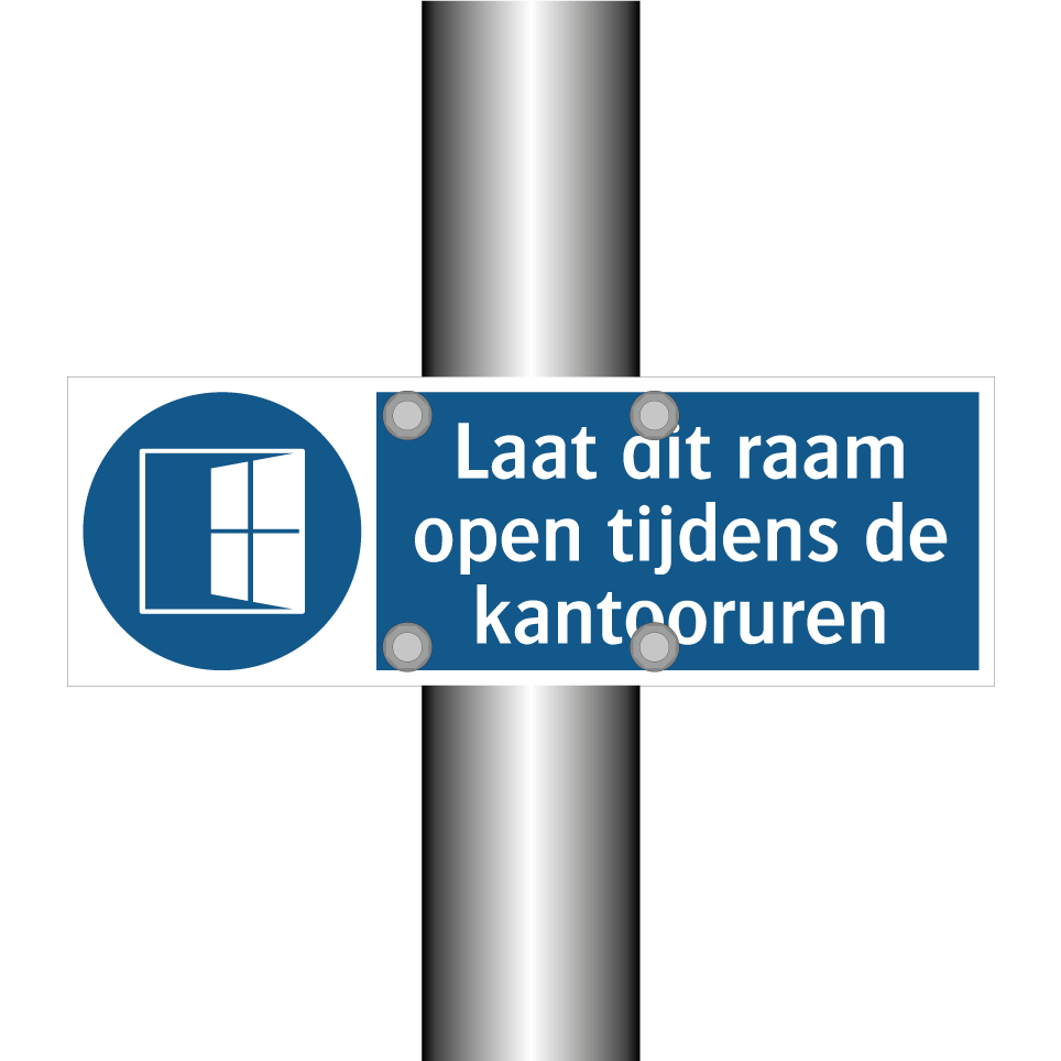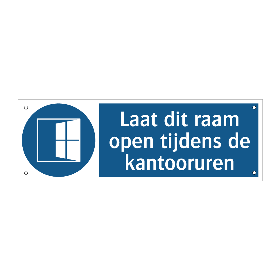 Verplichte bord met de tekst Laat dit raam open tijdens de kantooruren