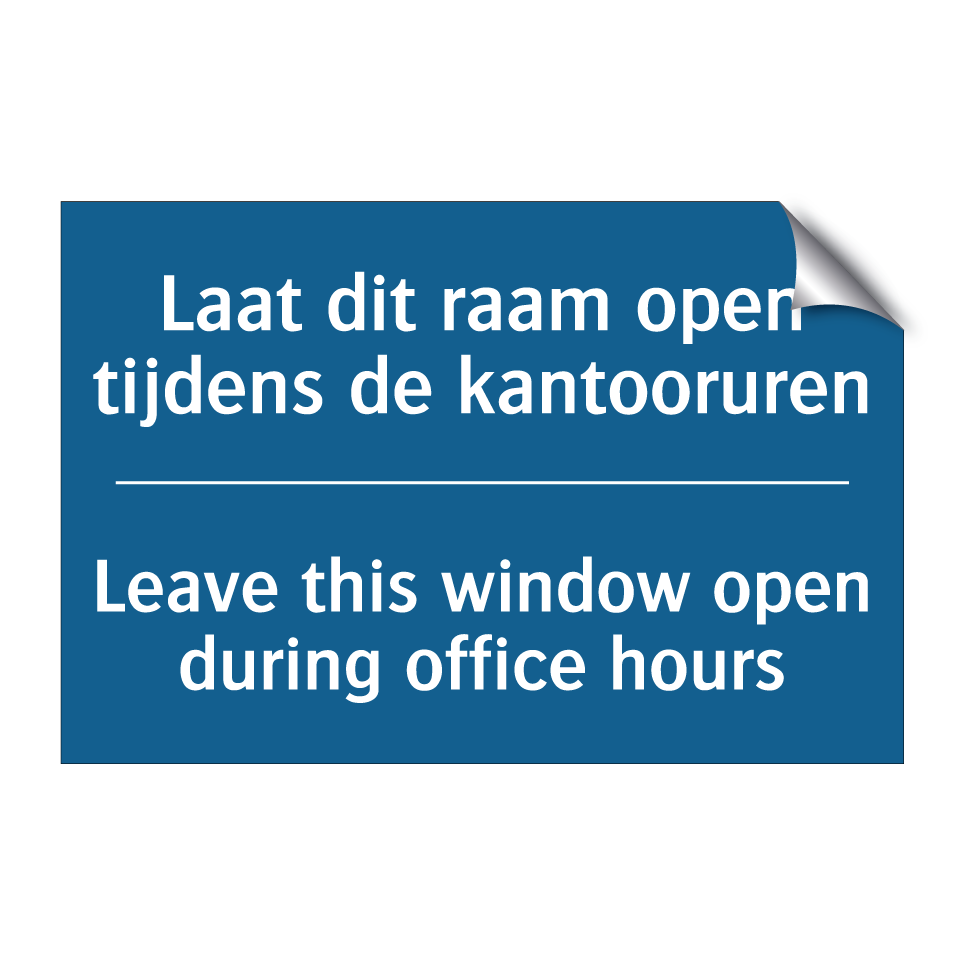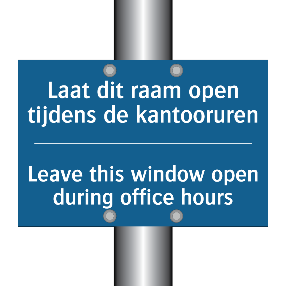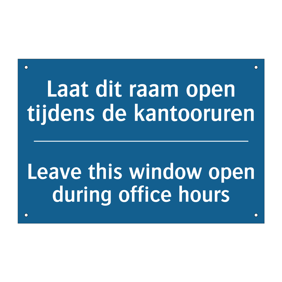 Verplichte bord met de tekst Laat dit raam open tijdens de kantooruren - Leave this window open during office hours