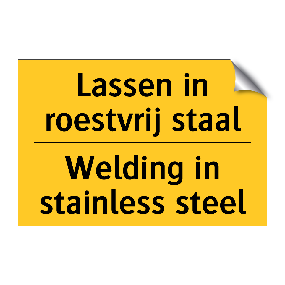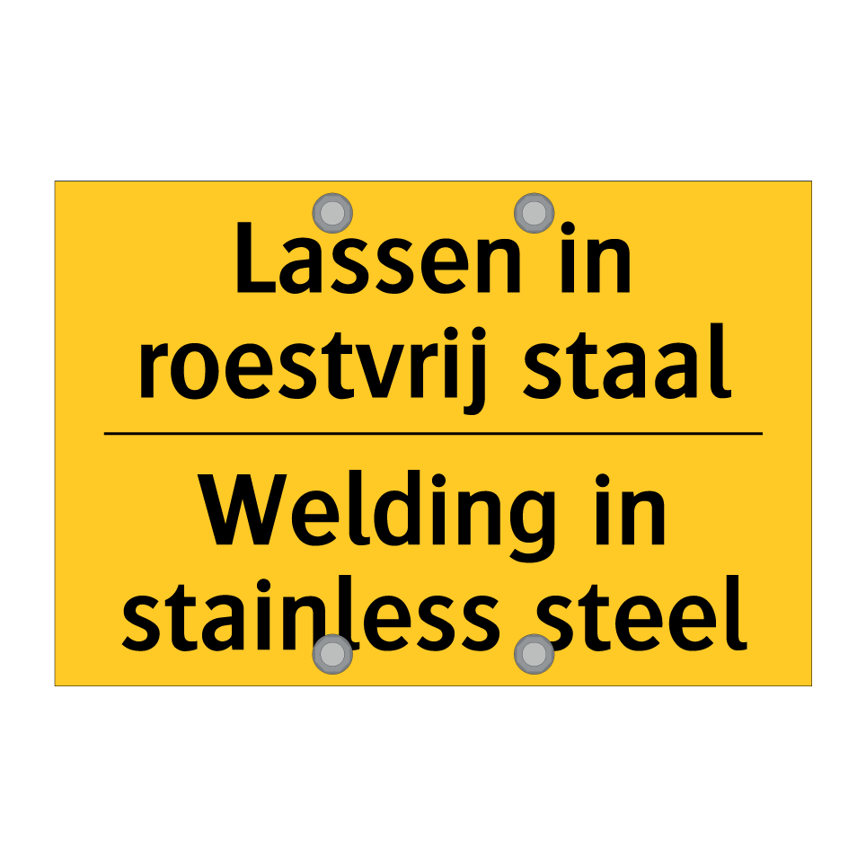 Waarschuwingsbord met de tekst Lassen in roestvrij staal / Welding in stainless steel