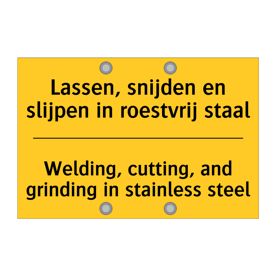 Waarschuwingsbord met de tekst Lassen, snijden en slijpen in roestvrij staal / Welding, cutting, and grinding in stainless steel