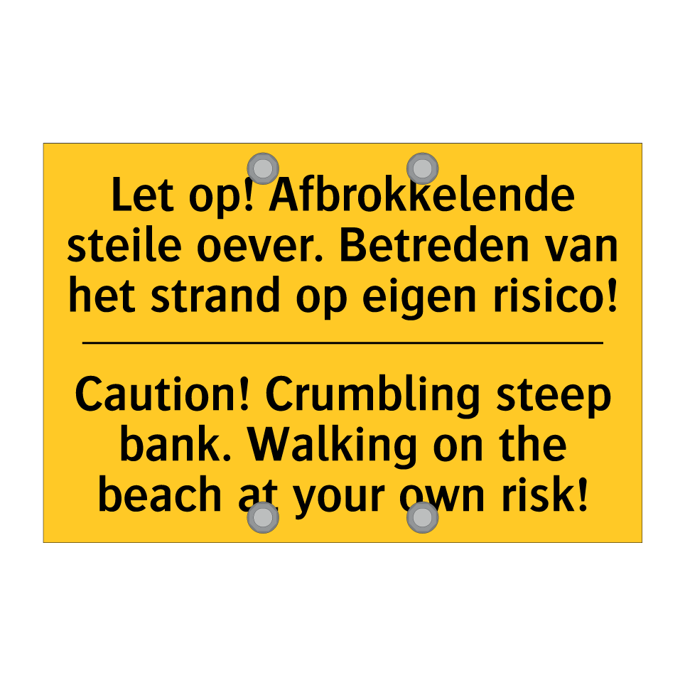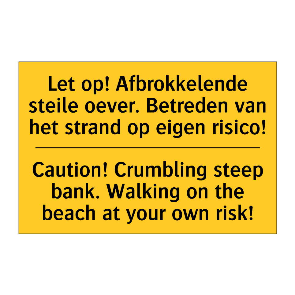 Waarschuwingsbord met de tekst Let op! Afbrokkelende steile oever. Betreden van het strand op eigen risico! / Caution! Crumbling steep bank. Walking on the beach at your own risk!