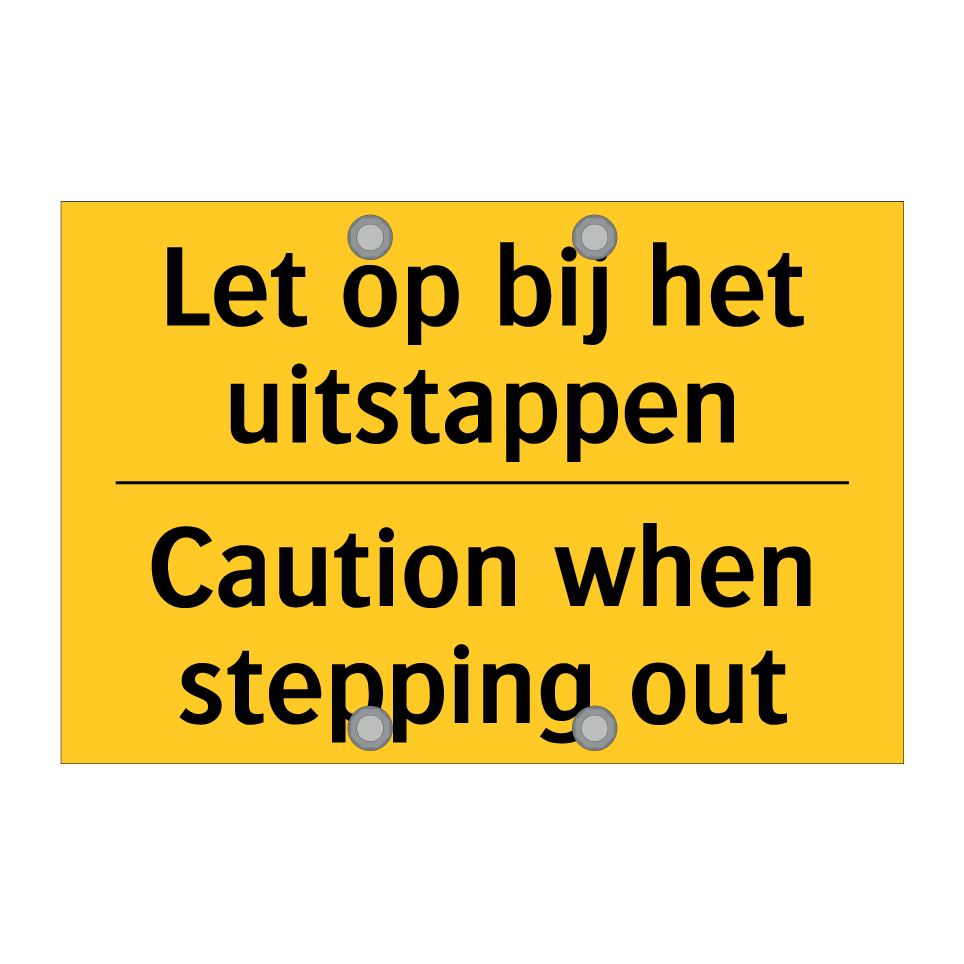 Waarschuwingsbord met de tekst Let op bij het uitstappen / Caution when stepping out