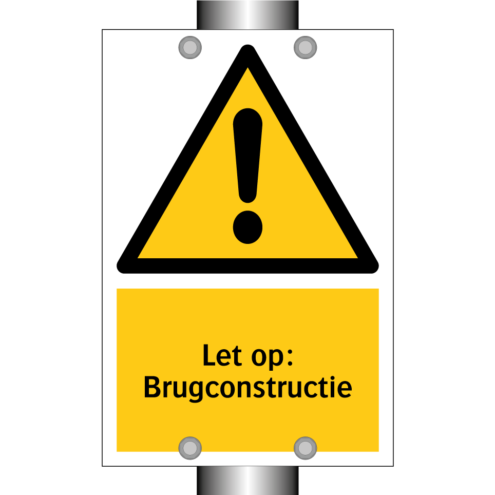 Waarschuwingsbord met de tekst Let op: Brugconstructie