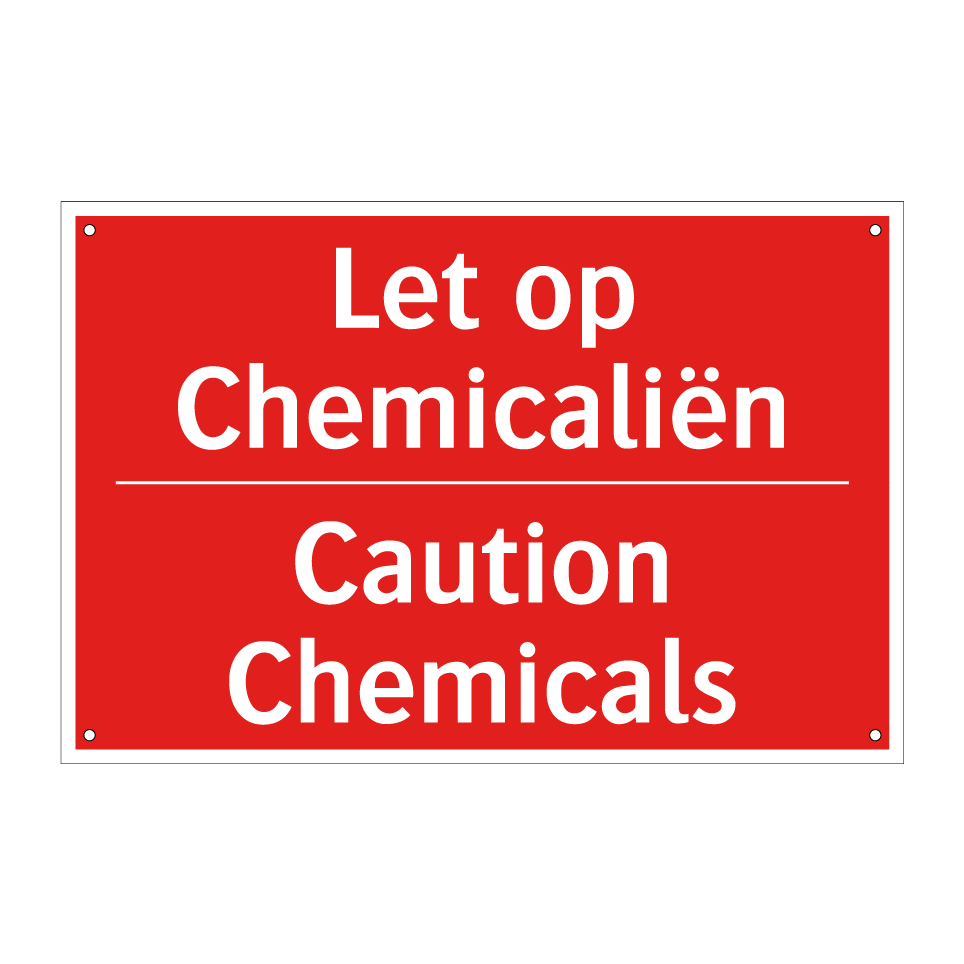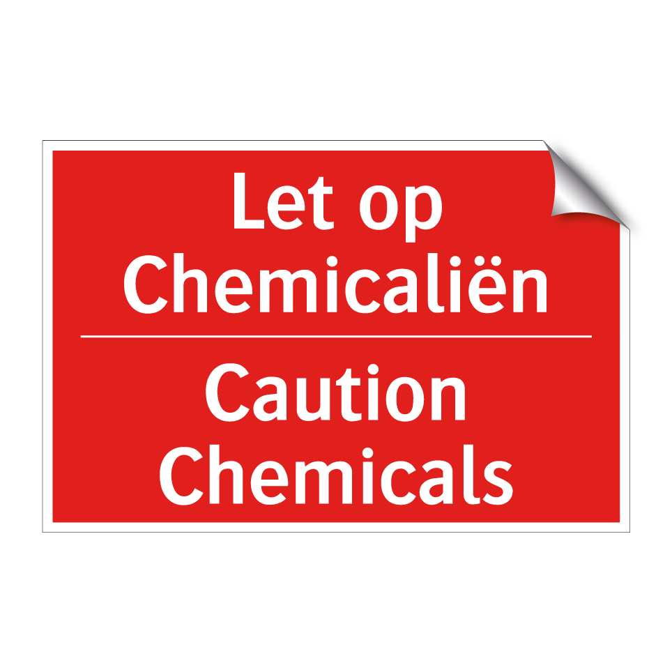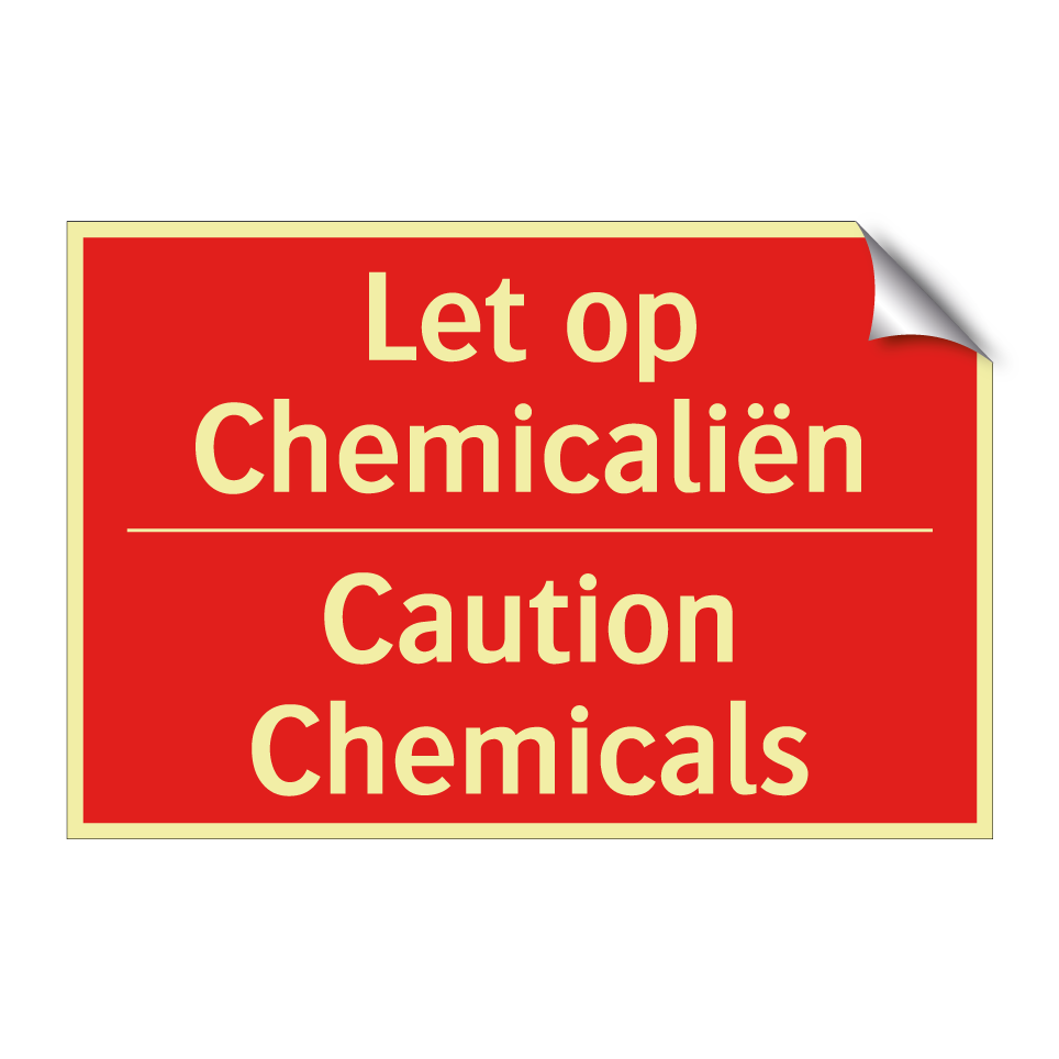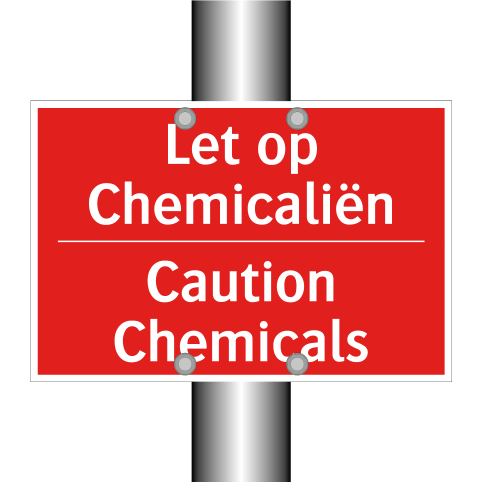 Brandbord met tekst Let op Chemicaliën - Caution Chemicals