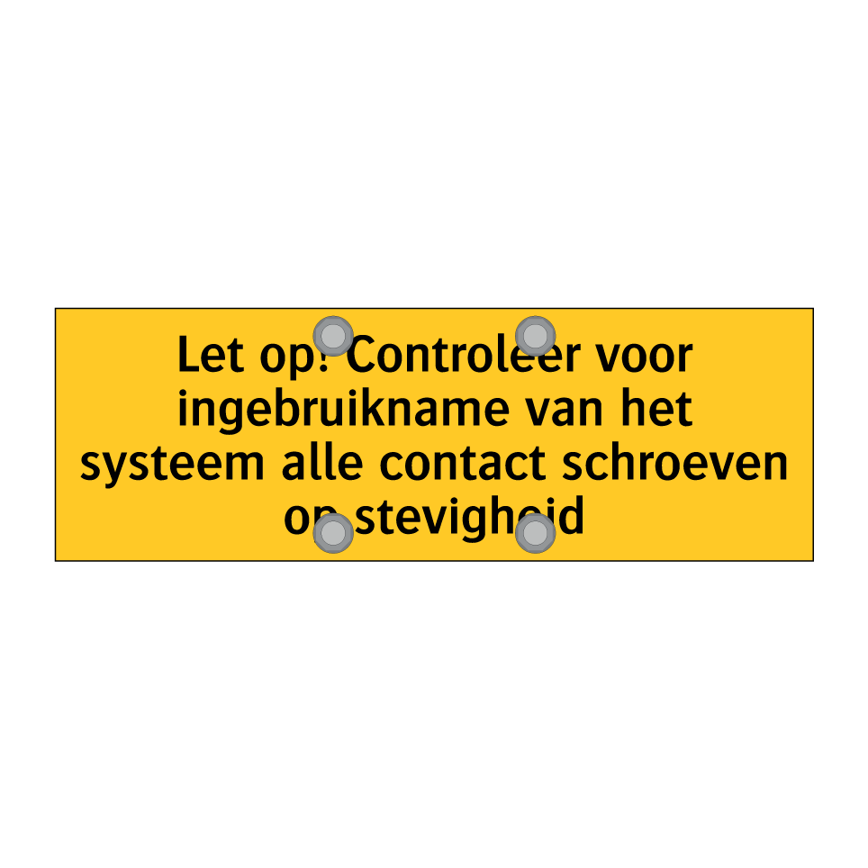 Waarschuwingsbord met de tekst Let op! Controleer voor ingebruikname van het systeem alle contact schroeven op stevigheid