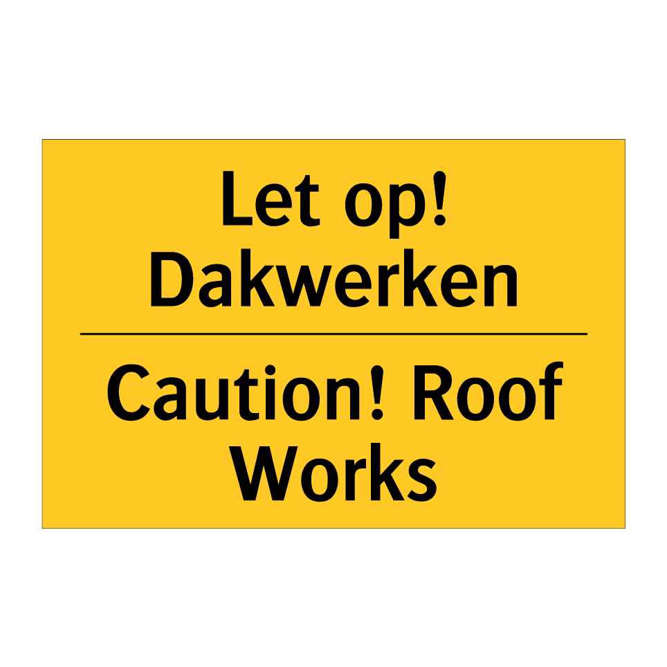 Waarschuwingsbord met de tekst Let op! Dakwerken / Caution! Roof Works