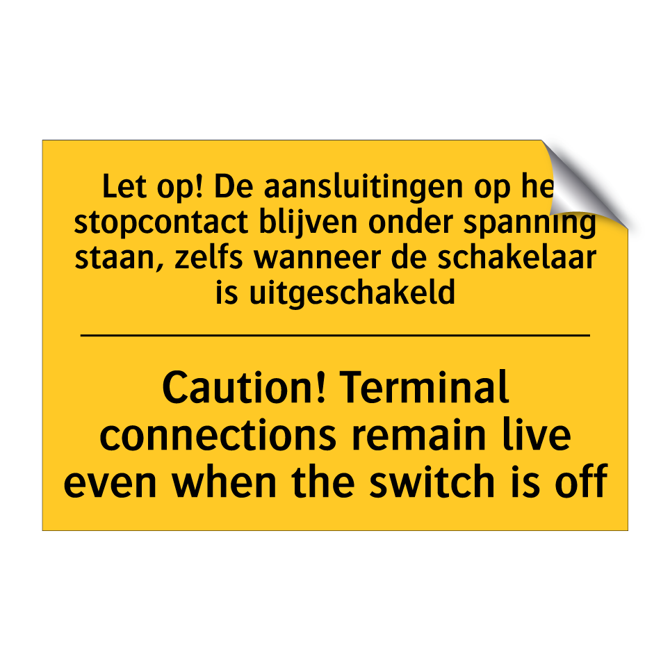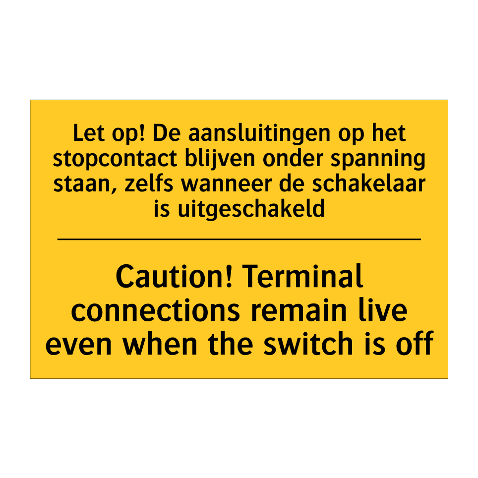 Waarschuwingsbord met de tekst Let op! De aansluitingen op het stopcontact blijven onder spanning staan, zelfs wanneer de schakelaar is uitgeschakeld / Caution! Terminal connections remain live even when the switch is off