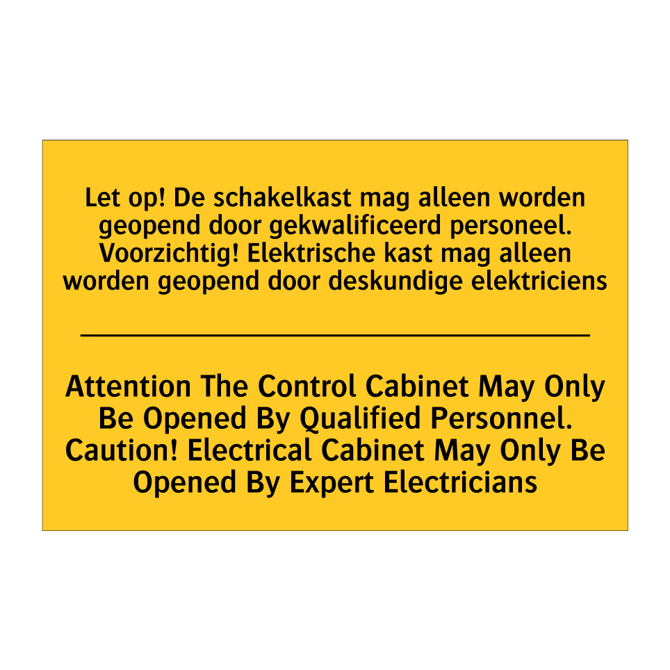 Waarschuwingsbord met de tekst Let op! De schakelkast mag alleen worden geopend door gekwalificeerd personeel. Voorzichtig! Elektrische kast mag alleen worden geopend door deskundige elektriciens / Attention The Control Cabinet May Only Be Opened By Qualified Personnel. Caution! Electrical Cabinet May Only Be Opened By Expert Electricians