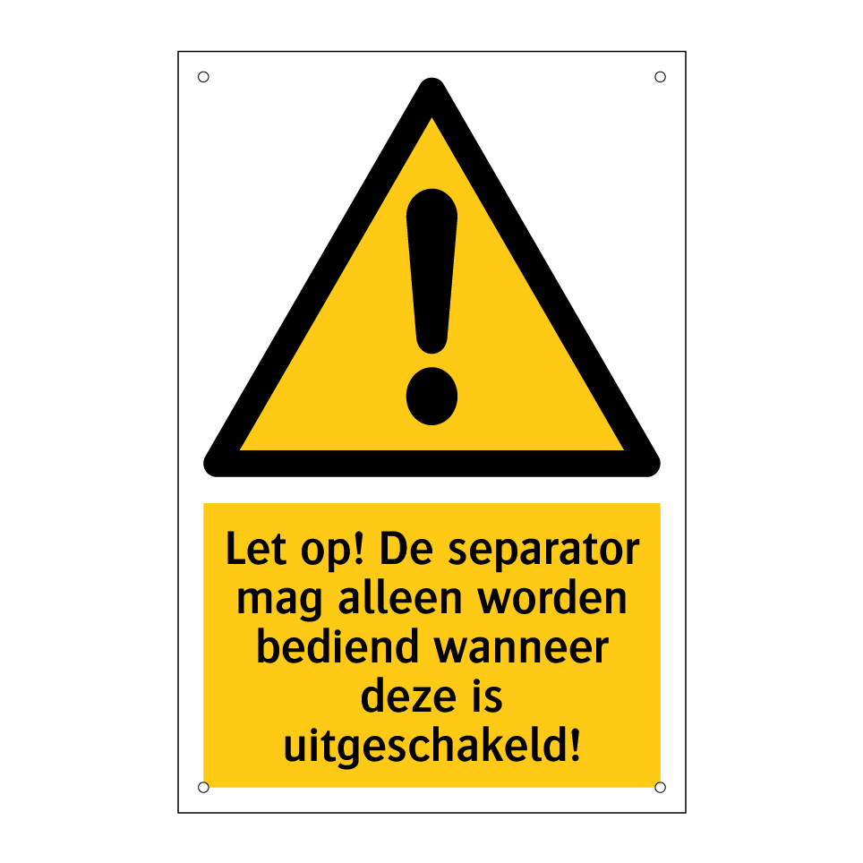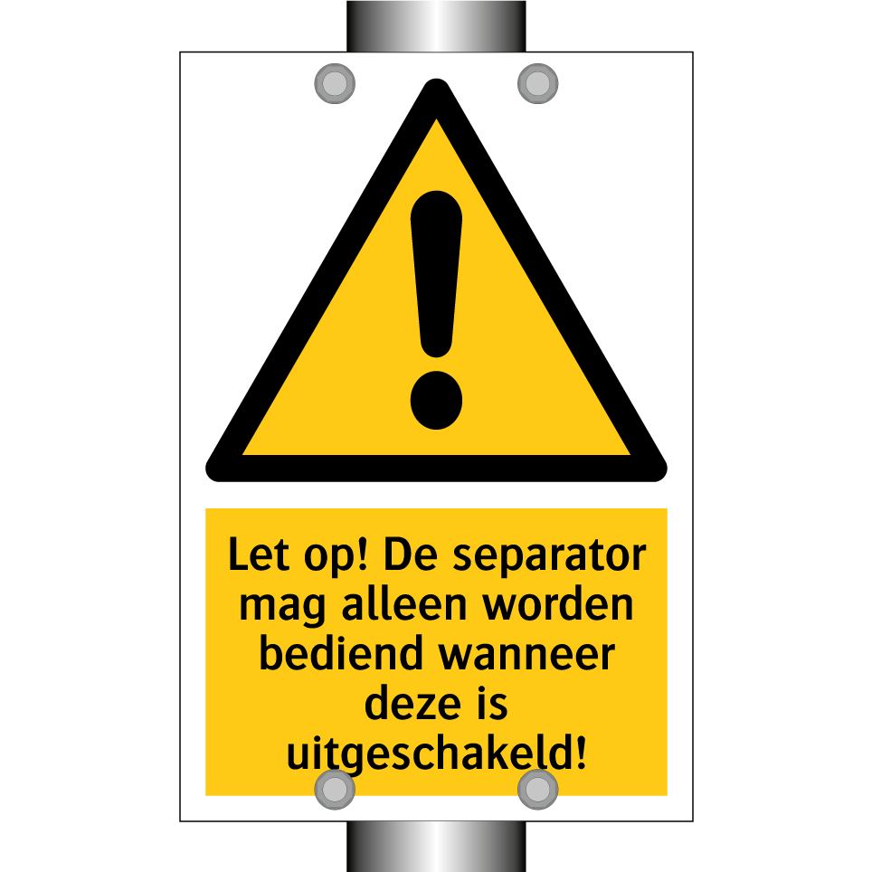 Waarschuwingsbord met de tekst Let op! De separator mag alleen worden bediend wanneer deze is uitgeschakeld!