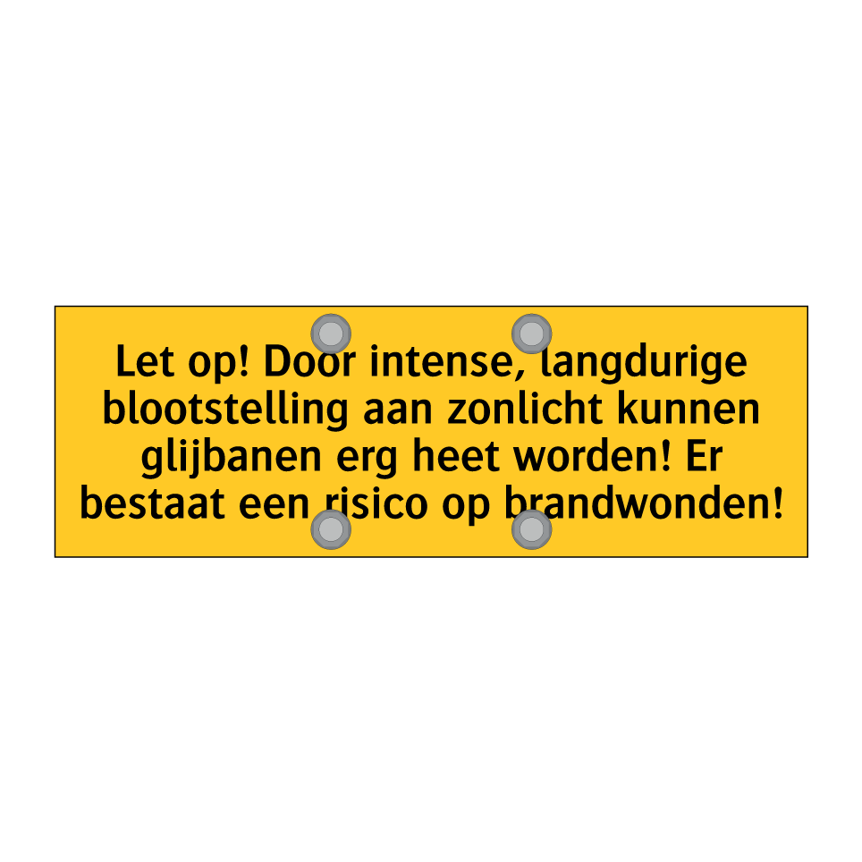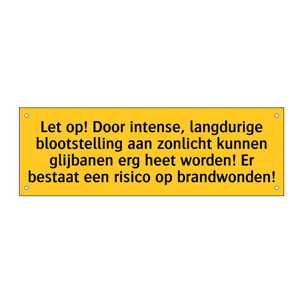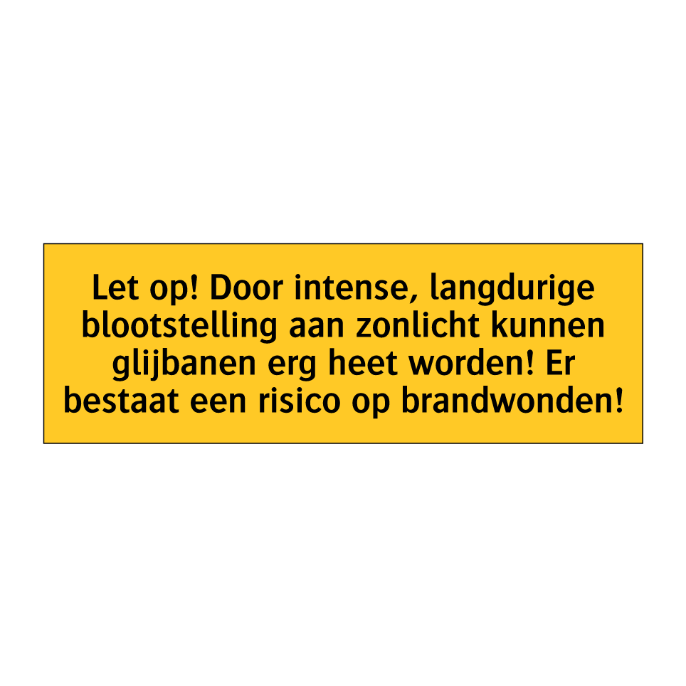 Deze waarschuwingsbord is essentieel voor speelplaatsen, parken en recreatiegebieden waar glijbanen aanwezig zijn. Het waarschuwt gebruikers voor het risico op brandwonden door langdurige blootstelling aan zonlicht, wat de glijbanen extreem heet kan maken. Plaats deze bord op goed zichtbare locaties nabij glijbanen om ouders en kinderen te informeren en te beschermen tegen mogelijke gevaren. Dit waarschuwingsbord met zijn opvallende gele achtergrond en zwarte tekst zorgt ervoor dat de boodschap duidelijk en snel wordt opgemerkt. Ideaal voor zowel openbare als privé speelomgevingen om de veiligheid te waarborgen.