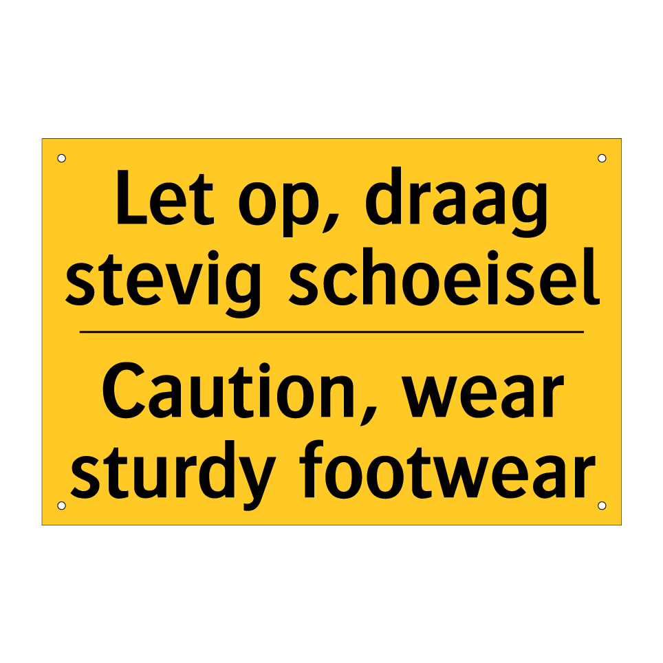Waarschuwingsbord met de tekst Let op, draag stevig schoeisel / Caution, wear sturdy footwear
