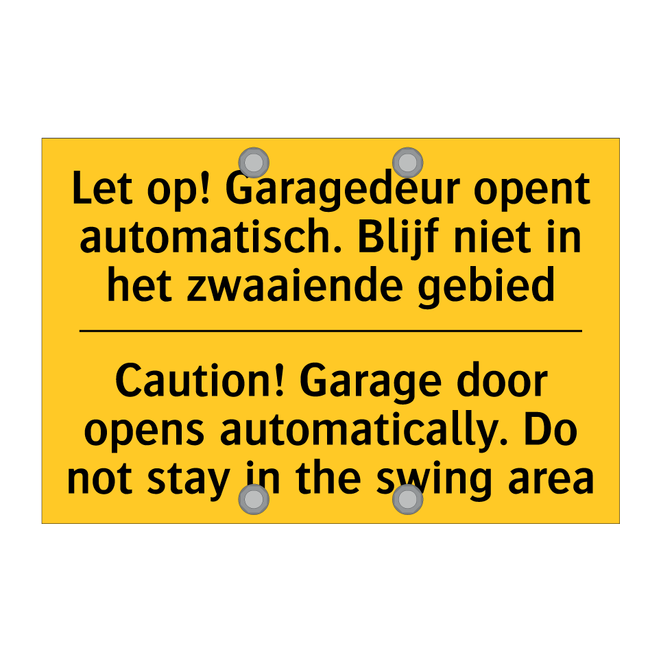 Waarschuwingsbord met de tekst Let op! Garagedeur opent automatisch. Blijf niet in het zwaaiende gebied / Caution! Garage door opens automatically. Do not stay in the swing area