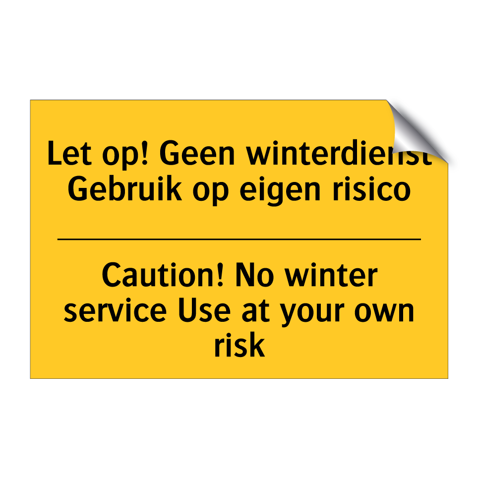 Waarschuwingsbord met de tekst Let op! Geen winterdienst Gebruik op eigen risico / Caution! No winter service Use at your own risk