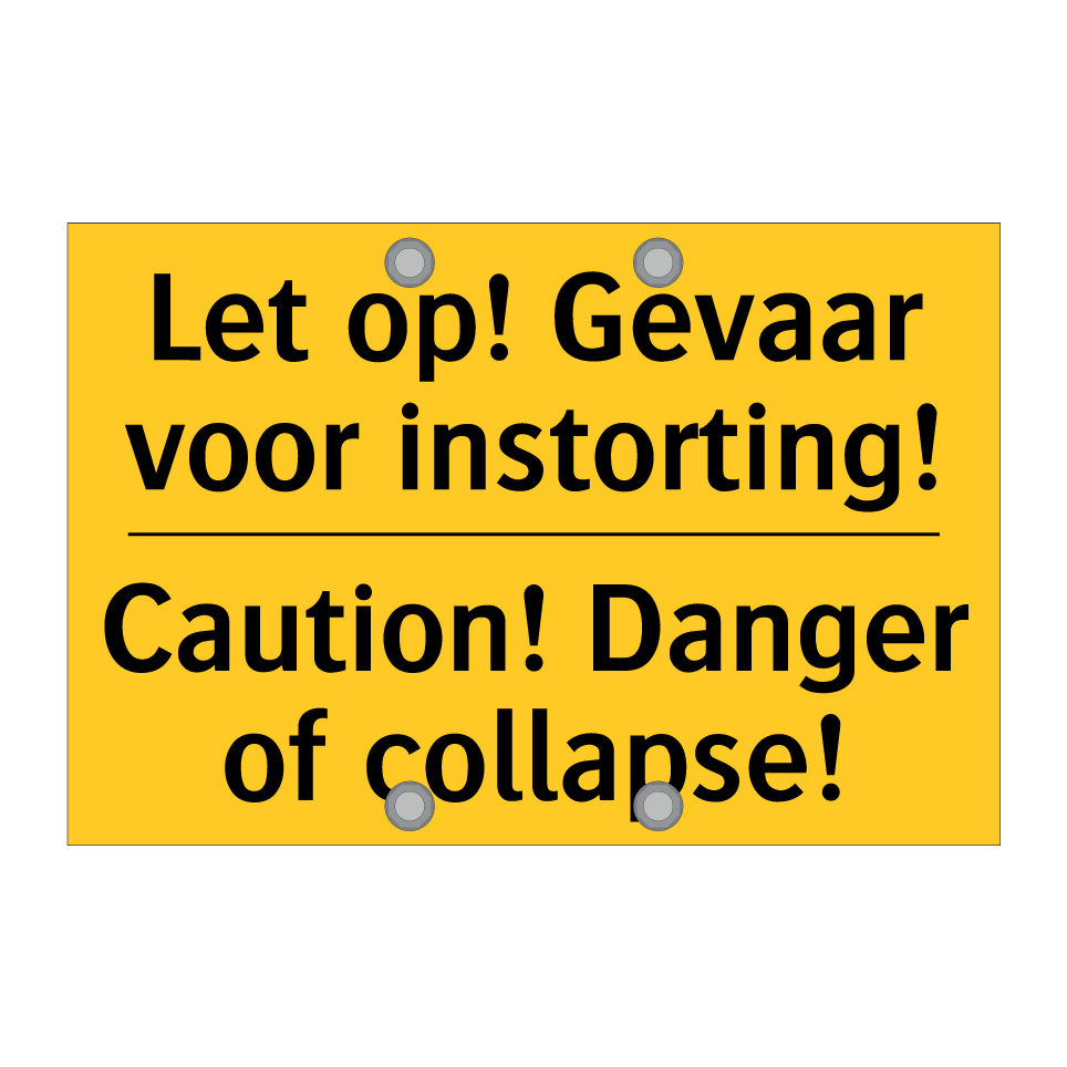 Waarschuwingsbord met de tekst Let op! Gevaar voor instorting! / Caution! Danger of collapse!