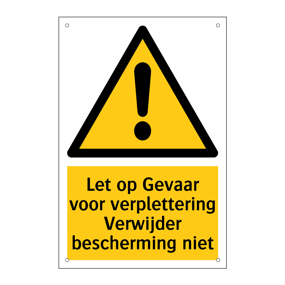 Deze waarschuwingsbord is essentieel voor het waarborgen van de veiligheid in industriële omgevingen. Het waarschuwt werknemers voor het risico van verplettering en benadrukt het belang van het niet verwijderen van beschermingsmiddelen. Plaats deze bord op strategische locaties zoals bij machines, transportbanden of andere apparatuur waar verpletteringsgevaar aanwezig is. Door deze duidelijke waarschuwing te geven, helpt u ongevallen te voorkomen en de werkplek veiliger te maken. Dit waarschuwingsbord is een onmisbaar onderdeel van uw veiligheidsmaatregelen en draagt bij aan een bewustere en veiligere werkomgeving.
