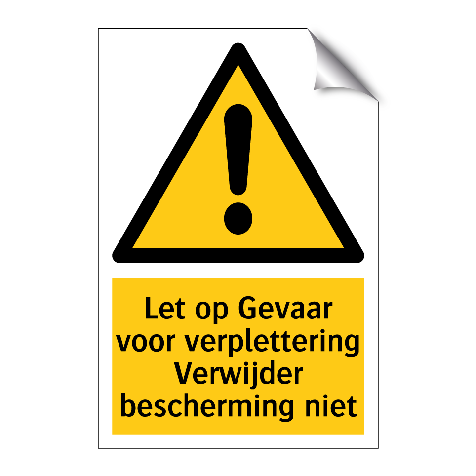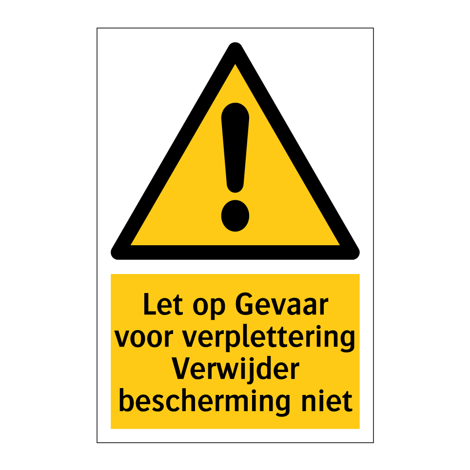 Waarschuwingsbord met de tekst Let op Gevaar voor verplettering Verwijder bescherming niet