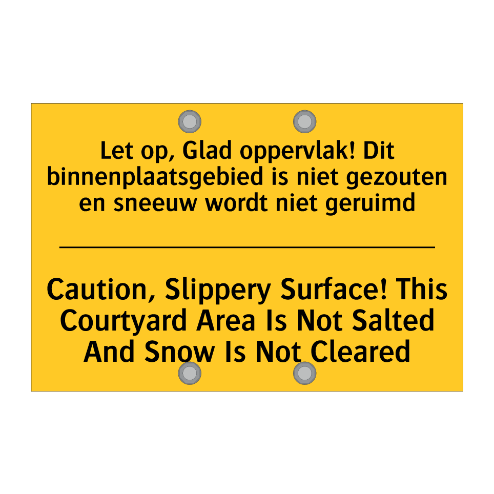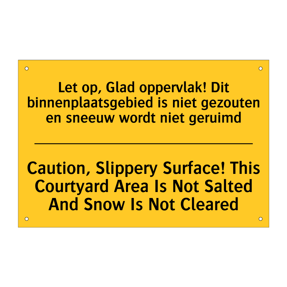 Waarschuwingsbord met de tekst Let op, Glad oppervlak! Dit binnenplaatsgebied is niet gezouten en sneeuw wordt niet geruimd / Caution, Slippery Surface! This Courtyard Area Is Not Salted And Snow Is Not Cleared