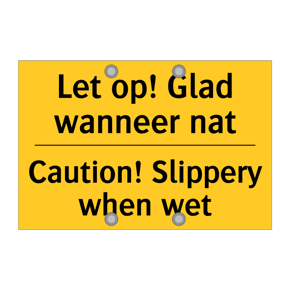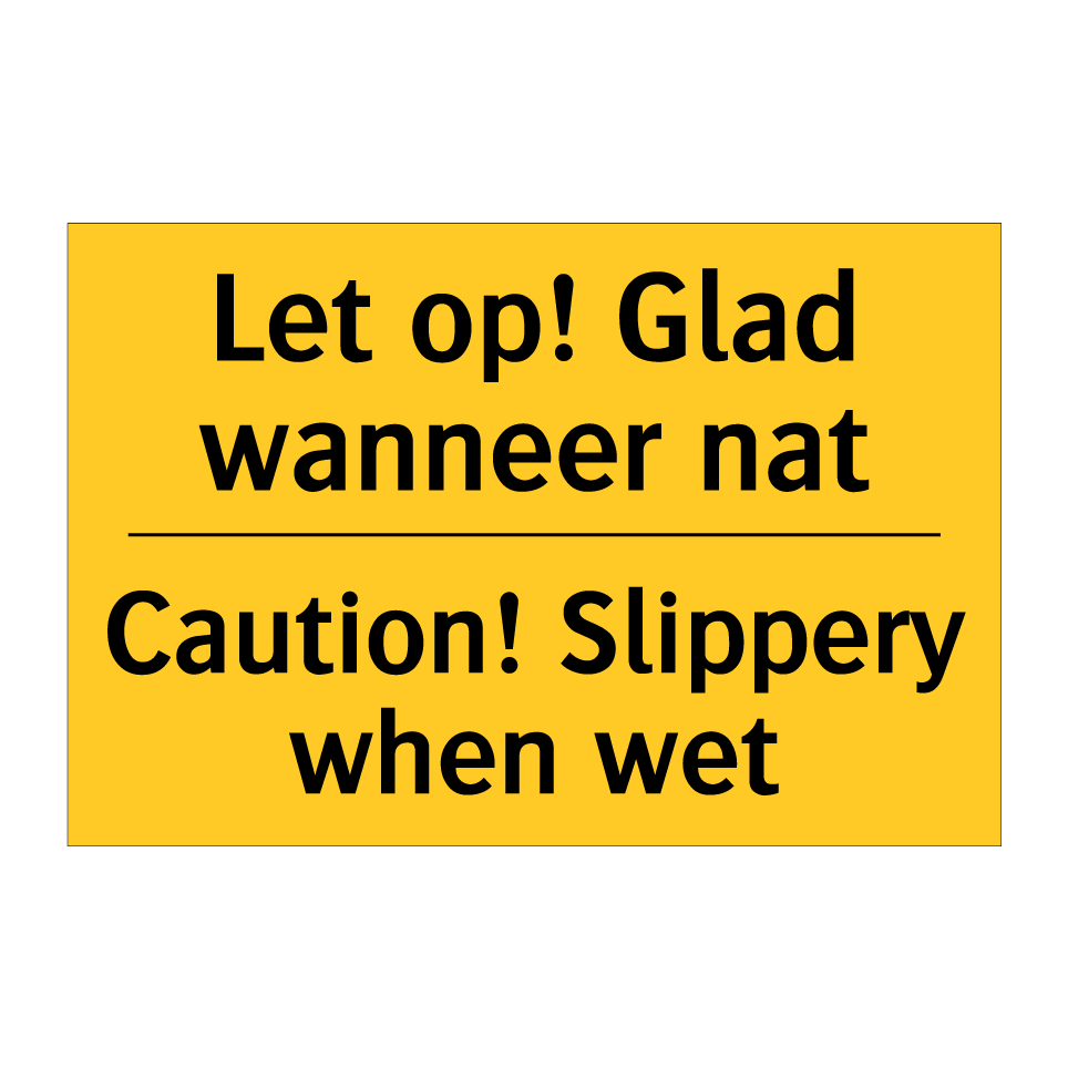 Waarschuwingsbord met de tekst Let op! Glad wanneer nat / Caution! Slippery when wet
