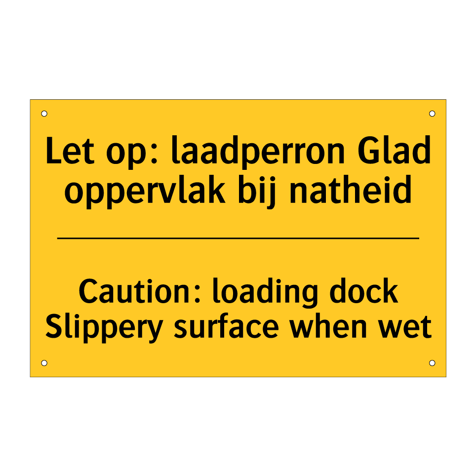 Waarschuwingsbord met de tekst Let op: laadperron Glad oppervlak bij natheid / Caution: loading dock Slippery surface when wet