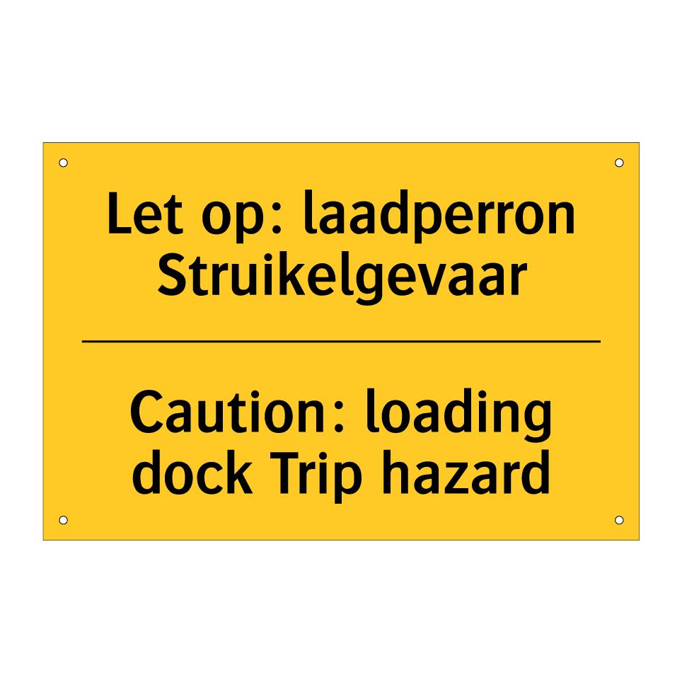 Waarschuwingsbord met de tekst Let op: laadperron Struikelgevaar / Caution: loading dock Trip hazard