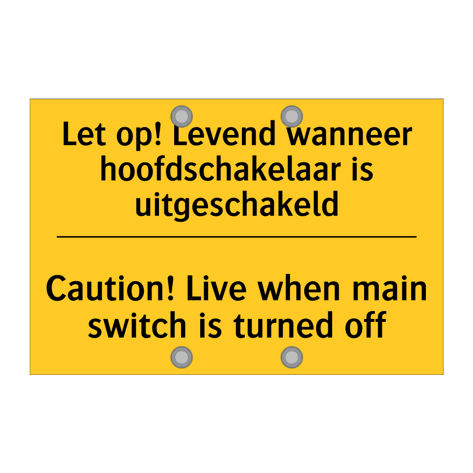 Waarschuwingsbord met de tekst Let op! Levend wanneer hoofdschakelaar is uitgeschakeld / Caution! Live when main switch is turned off