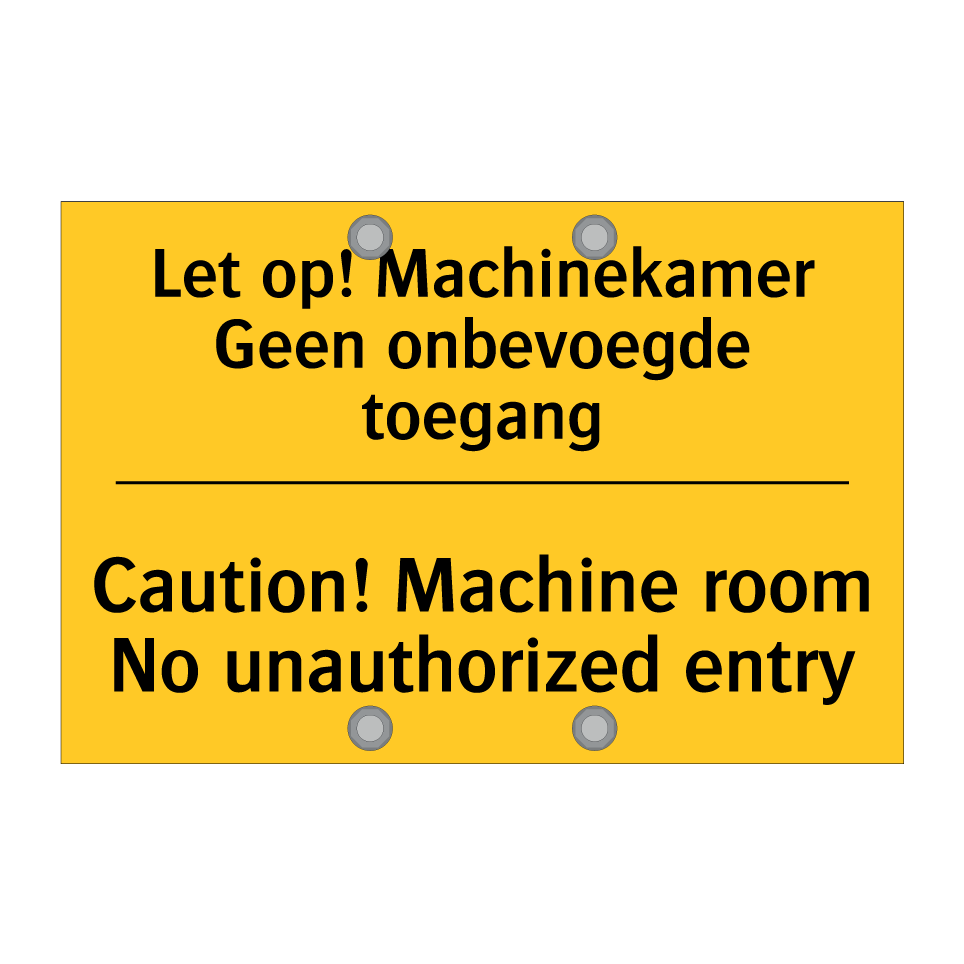 Waarschuwingsbord met de tekst Let op! Machinekamer Geen onbevoegde toegang / Caution! Machine room No unauthorized entry