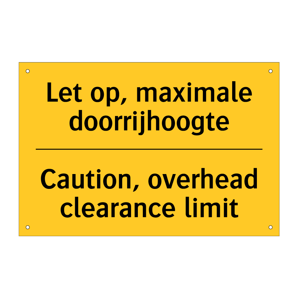 Dit waarschuwingsbord met een gele achtergrond en zwarte tekst is ideaal voor het aangeven van de maximale doorrijhoogte. De tweetalige tekst in zowel Nederlands als Engels zorgt ervoor dat zowel lokale als internationale chauffeurs de boodschap begrijpen, wat de veiligheid verhoogt. Dit bordje is perfect voor gebruik in parkeergarages, tunnels, laadperrons en andere locaties waar een beperkte doorrijhoogte geldt. Door de duidelijke en opvallende kleurencombinatie is het bord goed zichtbaar, zelfs van een afstand. Plaats dit waarschuwingsbord op strategische plekken om ongelukken en schade aan voertuigen te voorkomen.