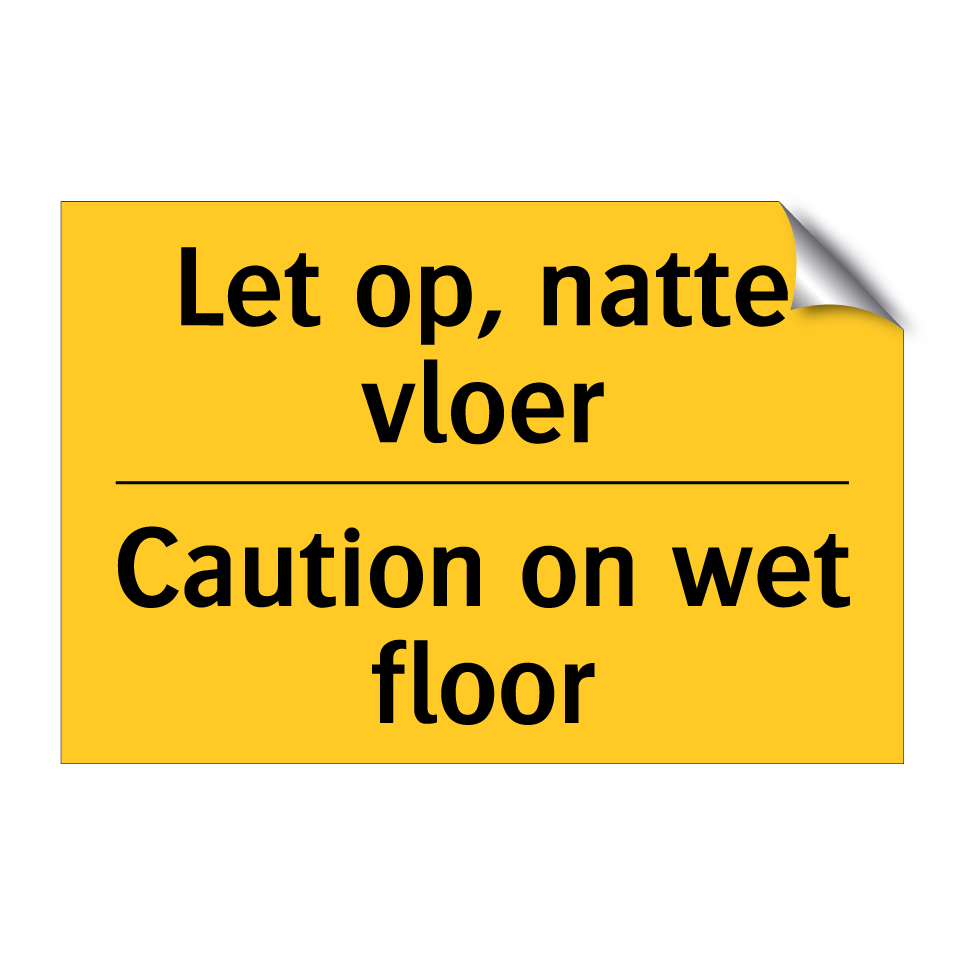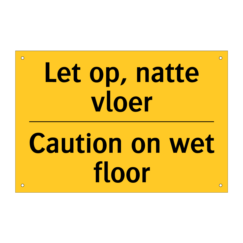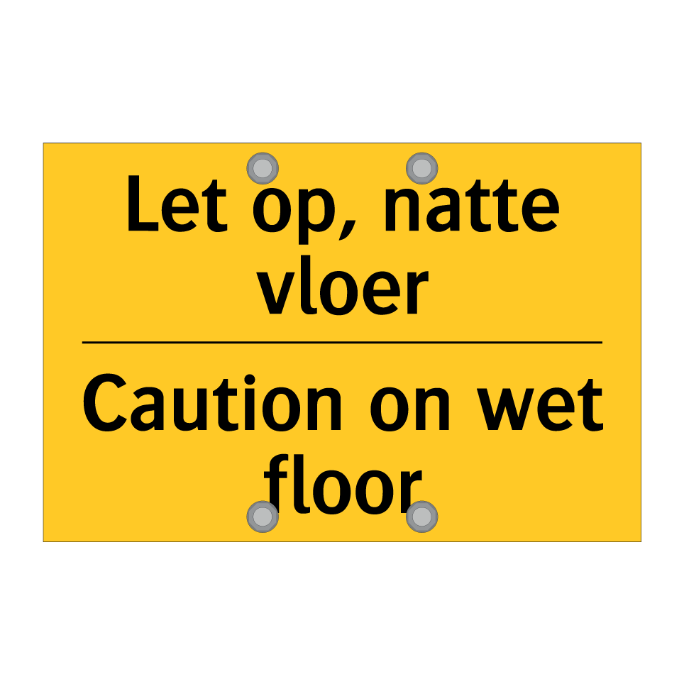 Waarschuwingsbord met de tekst Let op, natte vloer / Caution on wet floor