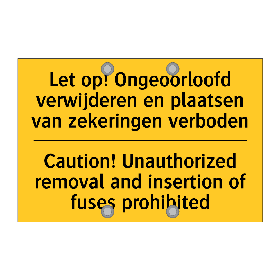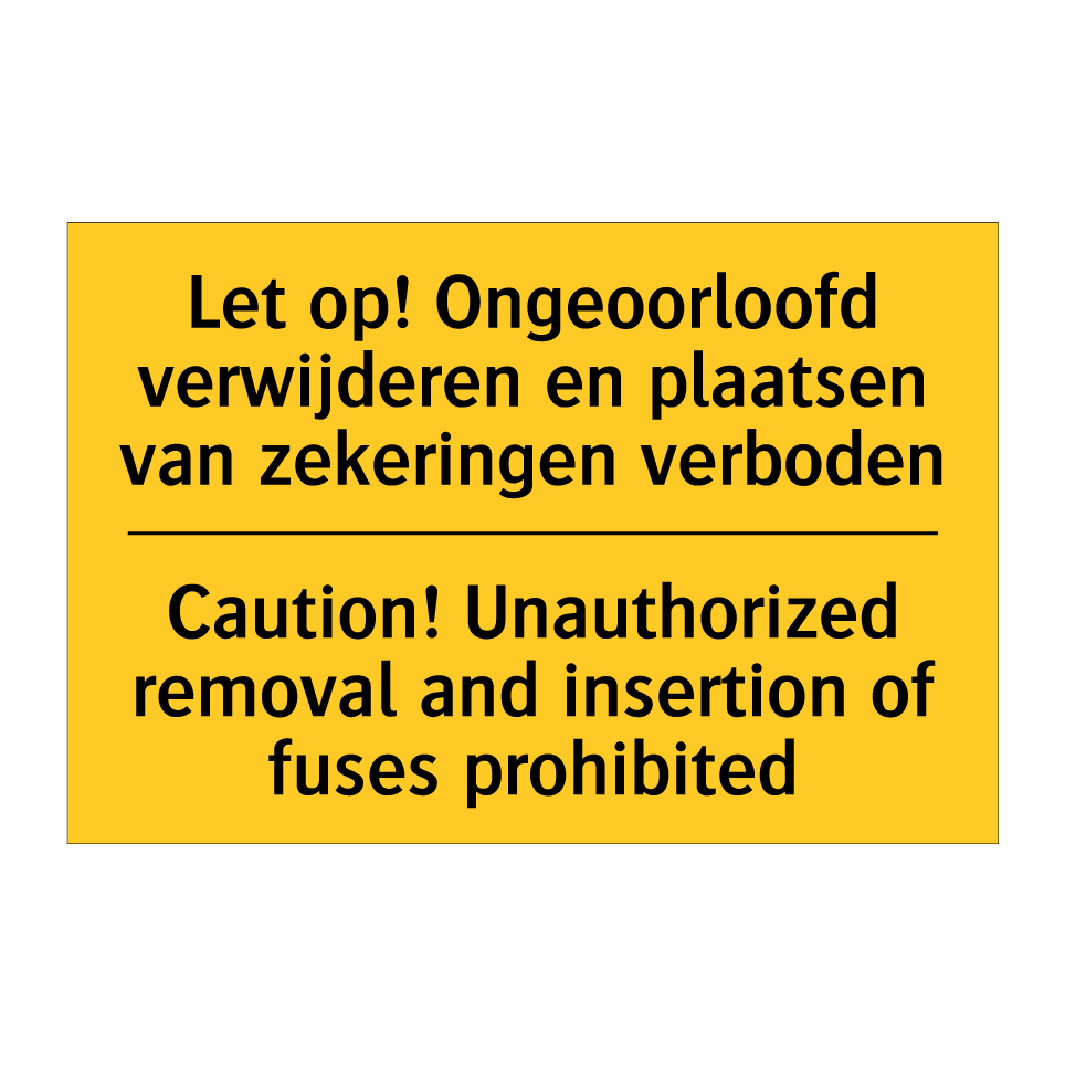 Waarschuwingsbord met de tekst Let op! Ongeoorloofd verwijderen en plaatsen van zekeringen verboden / Caution! Unauthorized removal and insertion of fuses prohibited