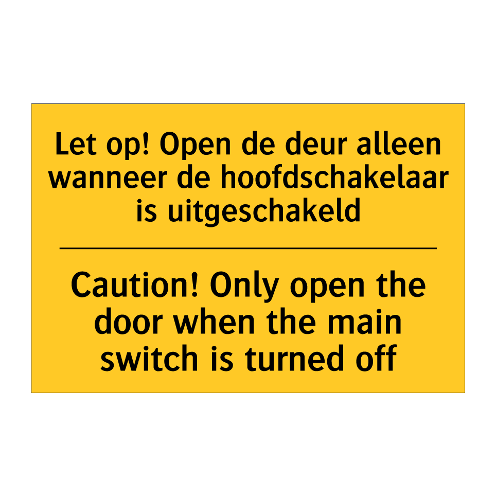 Waarschuwingsbord met de tekst Let op! Open de deur alleen wanneer de hoofdschakelaar is uitgeschakeld / Caution! Only open the door when the main switch is turned off